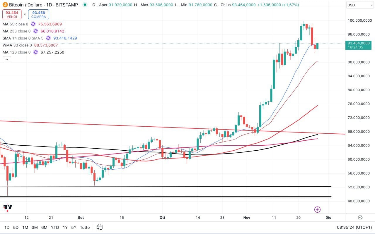Ieri il BITCOIN era sceso fino alla soglia dei 91000 dollari, per poi trovare un supporto e rimbalzare sopra i 93000 dollari.