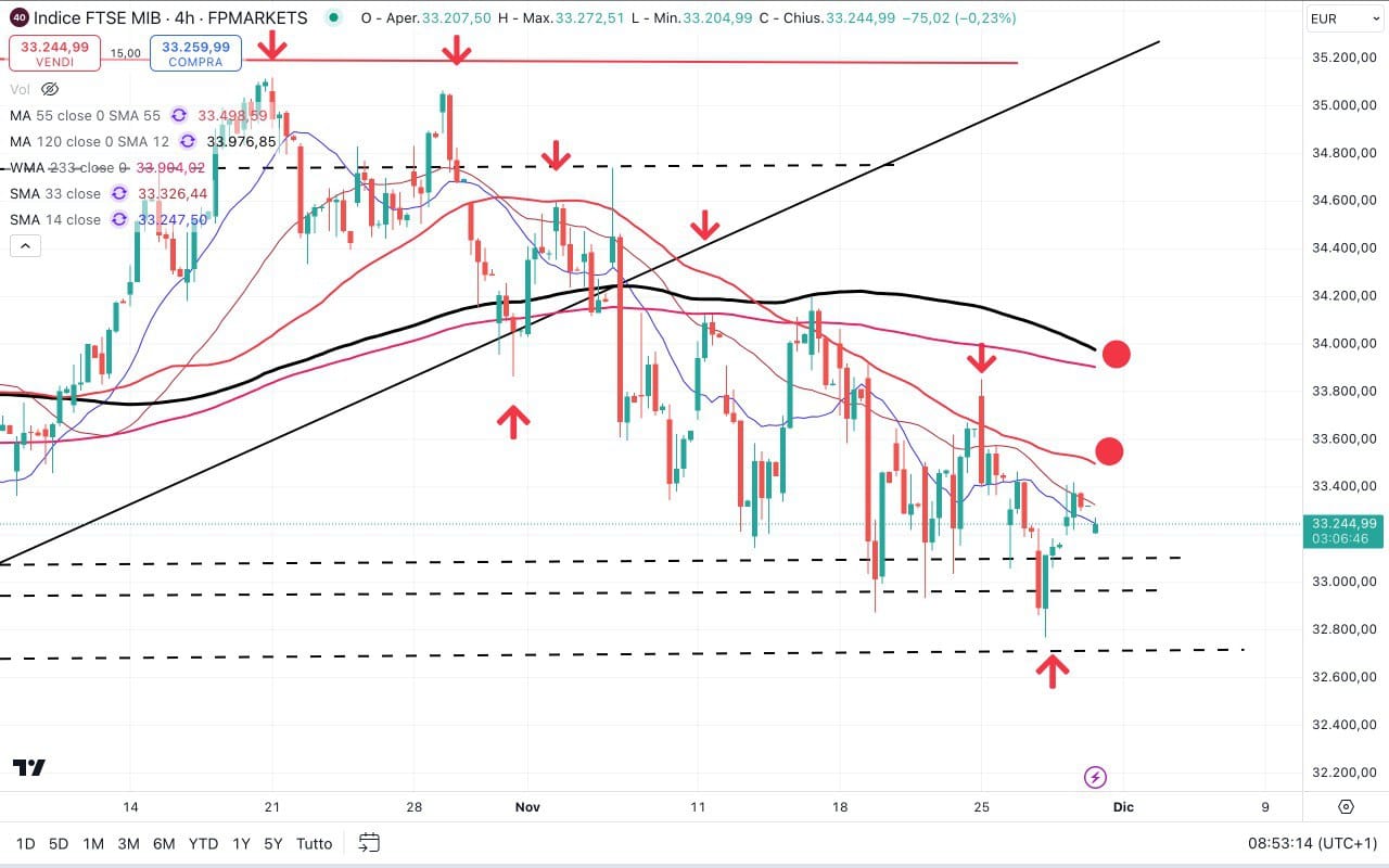 Passiamo ora agli INDICI e in particolare al MIB italiano, tornato nuovamente tra i 33100 e i 33200 punti circa.