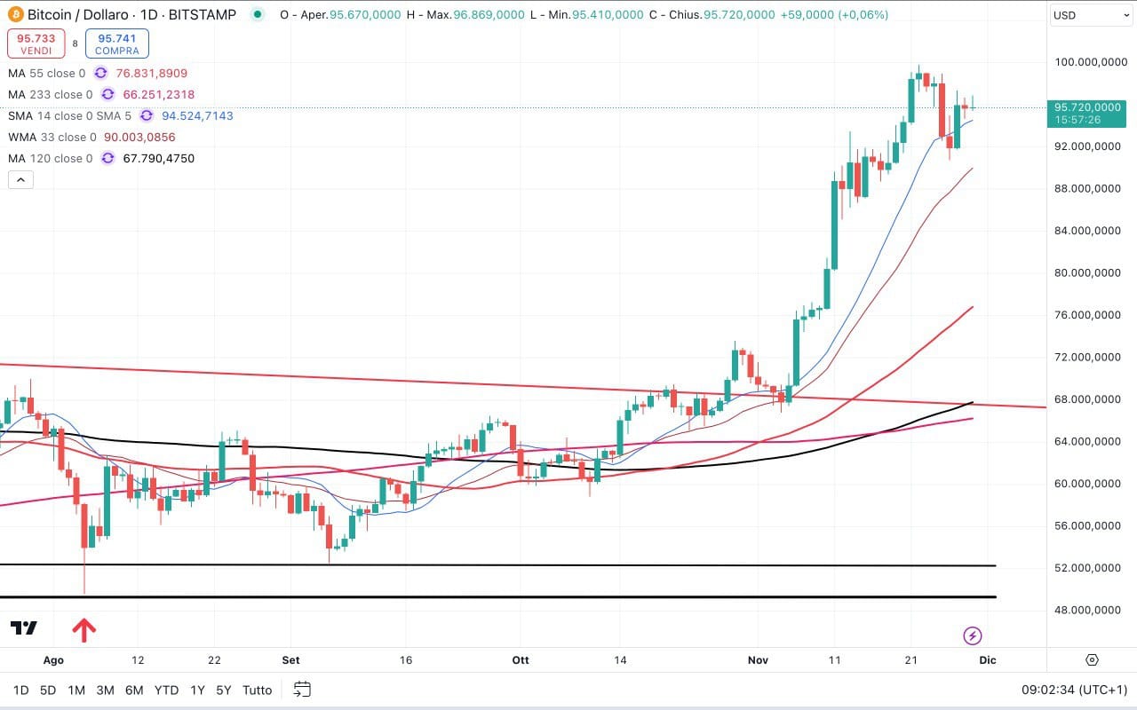 BITCOIN si trova poco sotto i 96000 dollari mentre ETHEREUM si sta muovendo tra i 3500 e i 3600 dollari.
