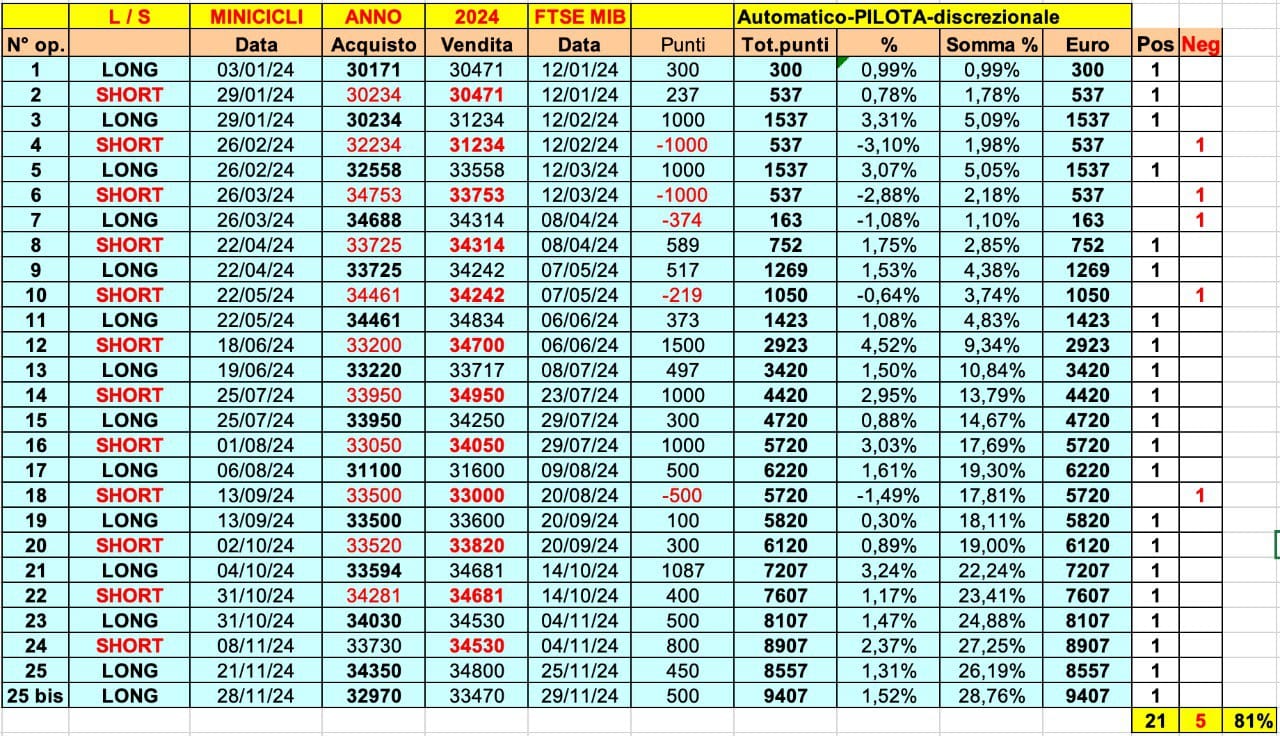 Qui sotto i risultati MINICICLI sul FTSE MIB (+9400 punti, +28,7%).
