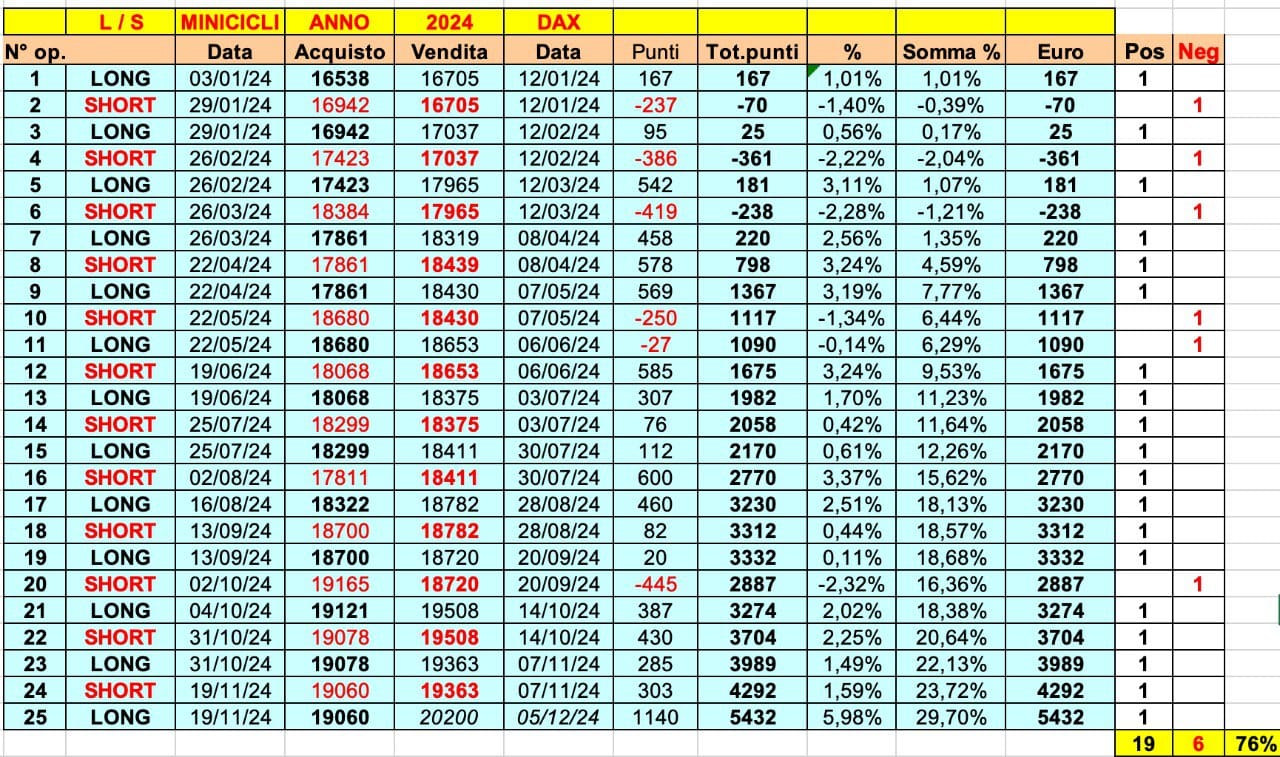 Segue il DAX (+5400 punti, +29%); 19 ONDE POSITIVE su 25.