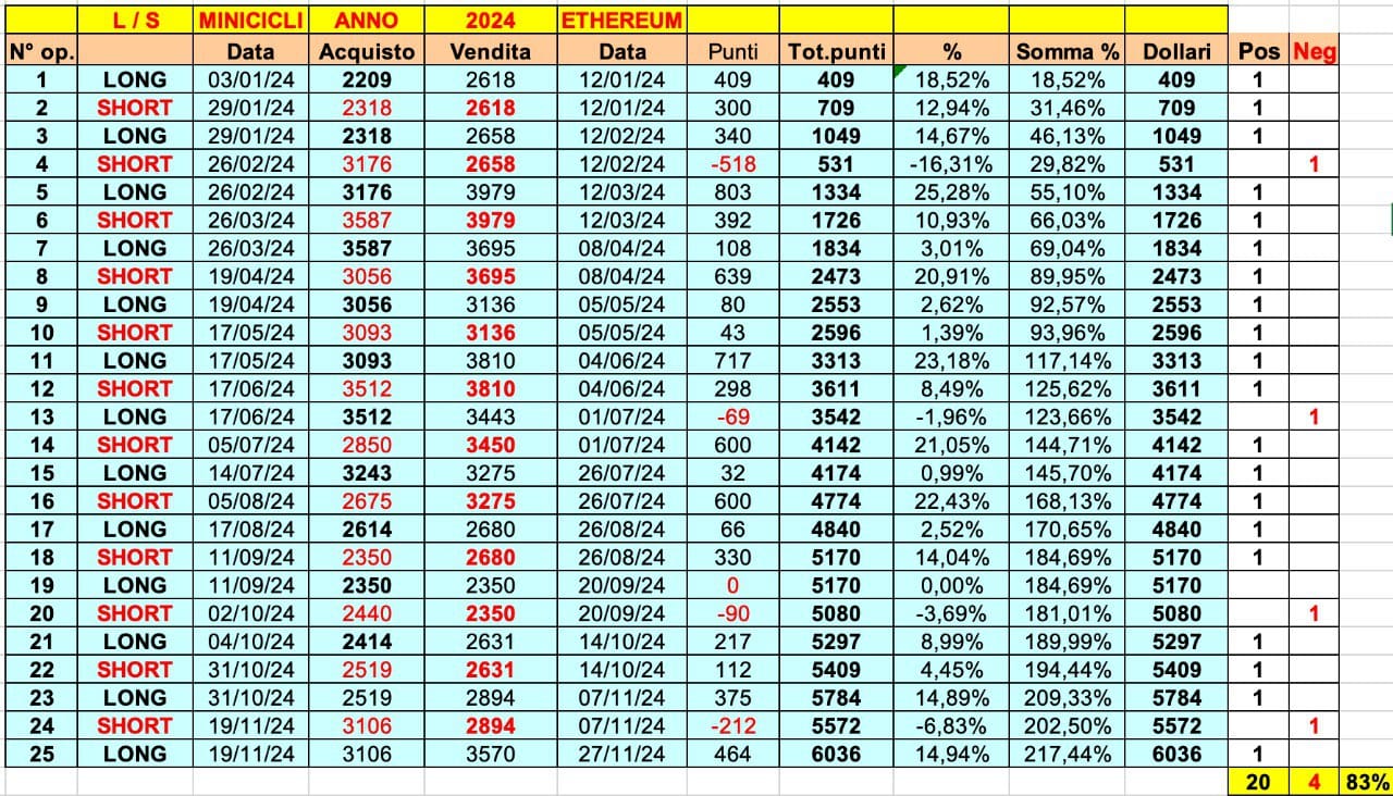 ETHEREUM si dimostra il miglior mercato nella correlazione con i MINICICLI: +217%, 6060 punti/dollari e 20 ONDE POSITIVE su 25 (una neutra).BUON WEEK-END !