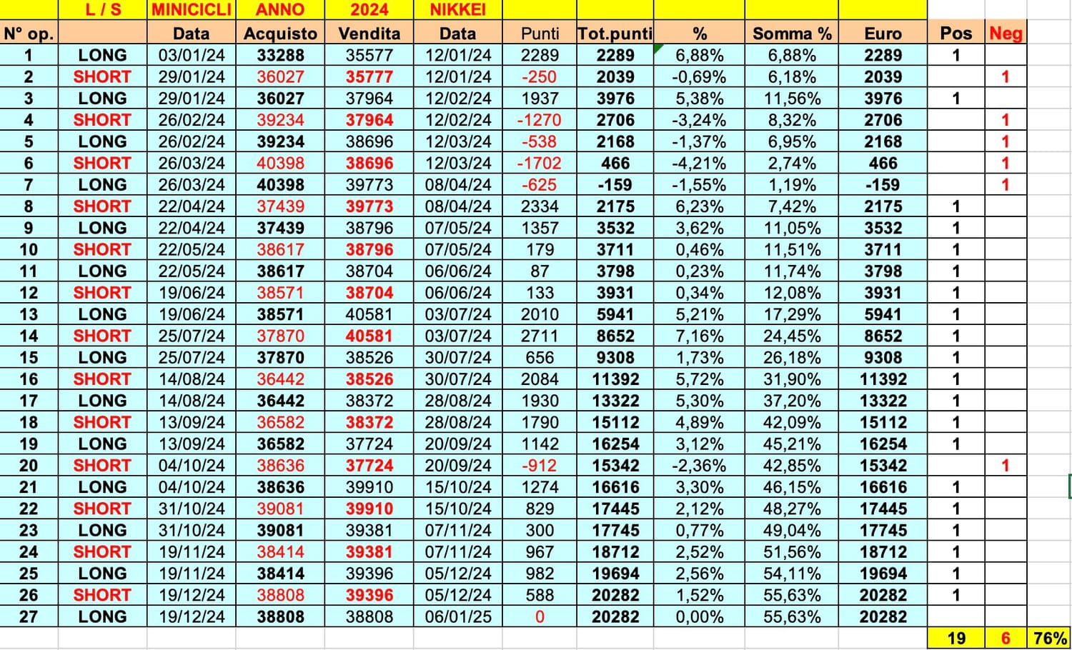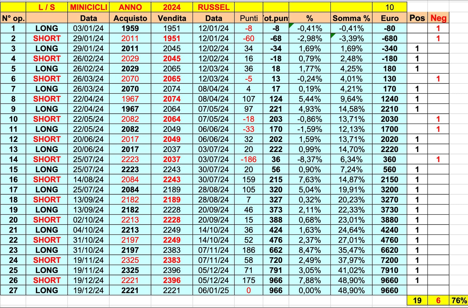Sappiamo che i RISULTATI MINICICLI del 2024 sono stati veramente ottimi ma vi è sempre il “nodo” dell’applicazione, che va colmato con il giusto approccio mentale (MINDSET) e con la corretta impostazione degli automatismi in base al capitale disponibile e alla SIZE da utilizzare.