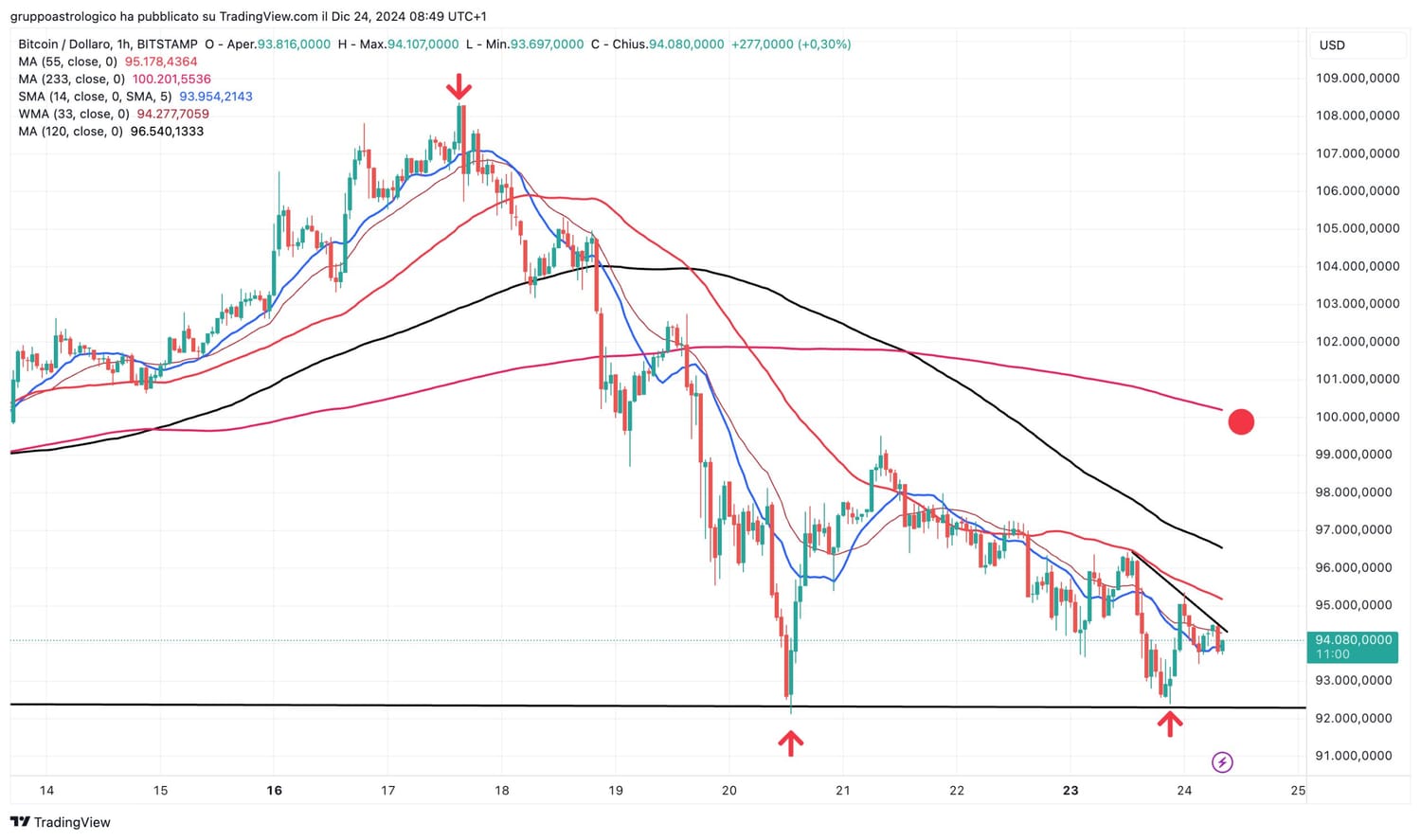 Non è escluso che il prezzo possa nuovamente scendere verso i 92000 dollari per un doppio minimo di breve.