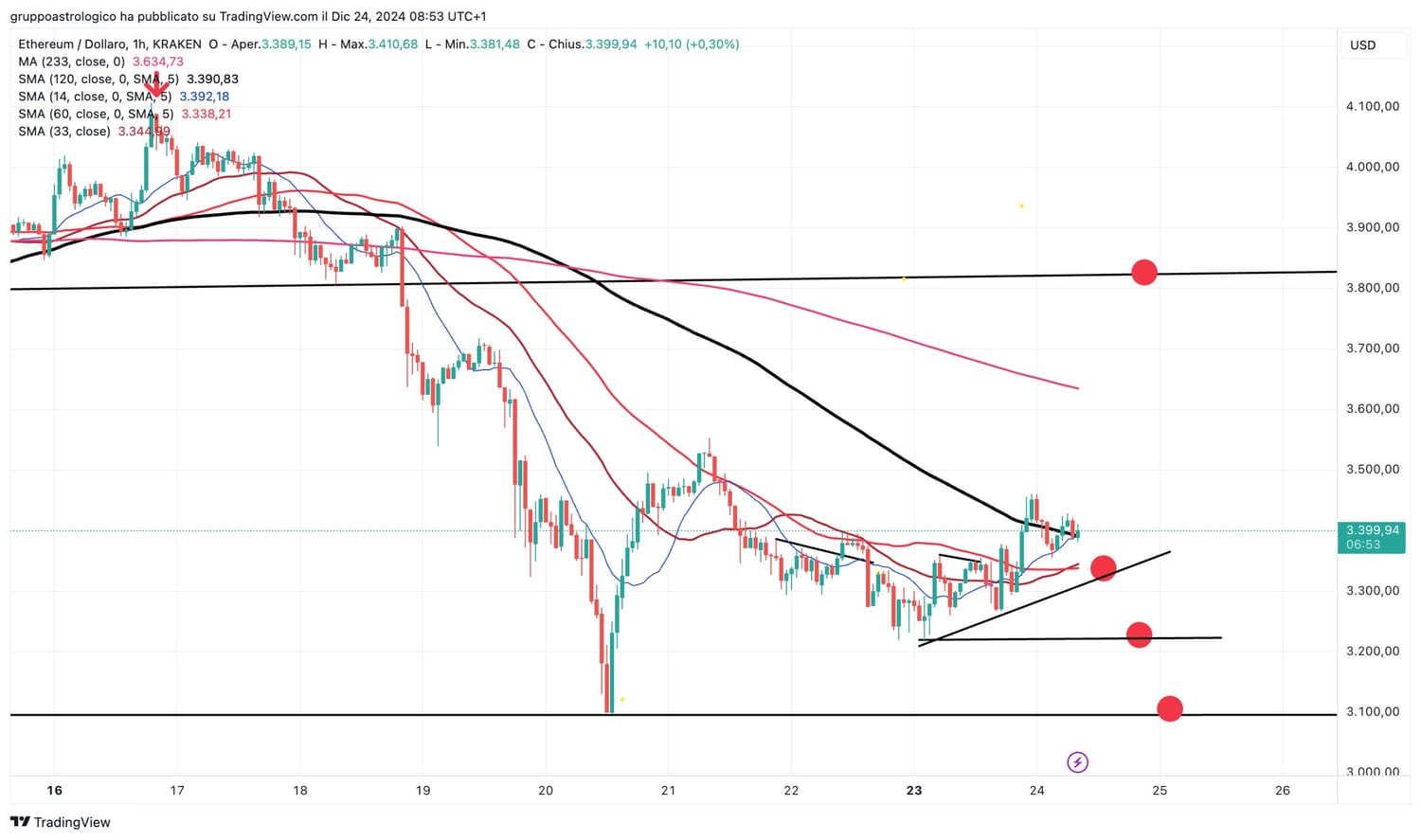 Mentre BITCOIN ha già fatto un doppio minimo di breve, ETHEREUM è rimasto per ora sopra i 3100 punti del 20 Dicembre e staziona al momento attorno ai 3400 dollari.