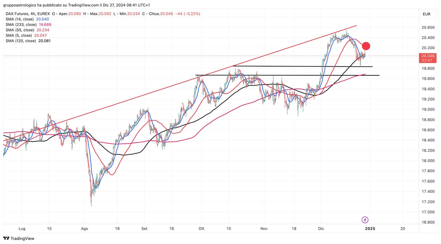 E’ già stato raggiunto un supporto attorno ai 19800 punti, con parziale rimbalzo verso i 20100 punti, mentre vi sarebbe un altro supporto verso i 19650-19700 punti.