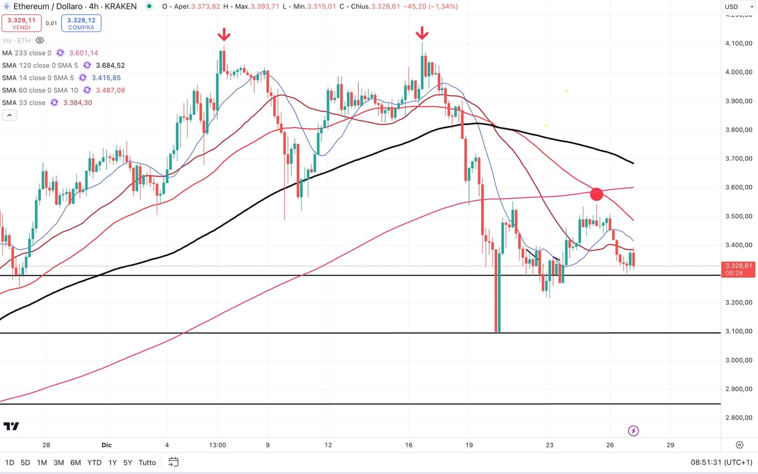 Anche ETHEREUM infatti ha raggiunto una RESISTENZA attorno ai 3550 dollari per poi ridiscendere verso gli attuali 3300-3350 dollari.