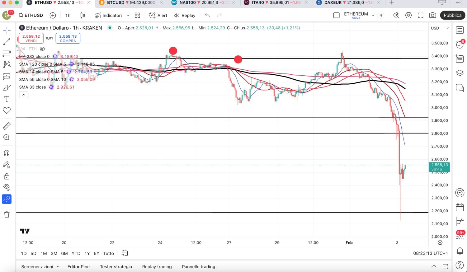 Stessa cosa su ETHEREUM, da 2880 a 2680 (prima quota short).
