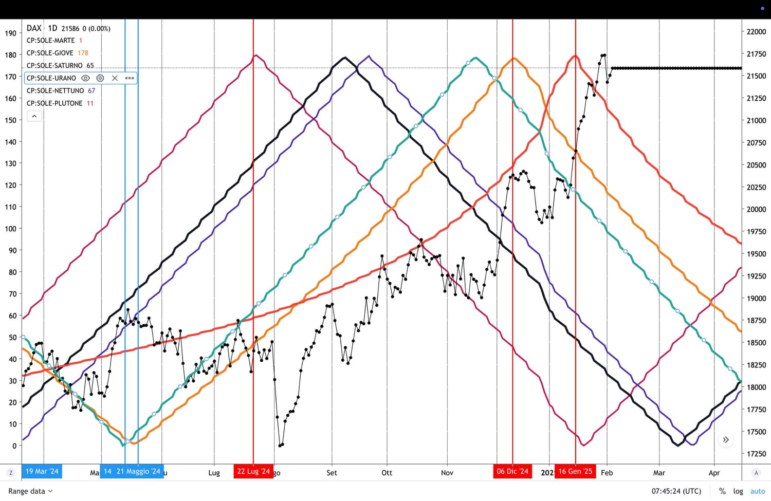 Ricordo che ci troviamo nell’ambito del TRIGONO SOLE-GIOVE, che è notoriamente un aspetto POSITIVO, che sta dunque sostenendo i mercati.