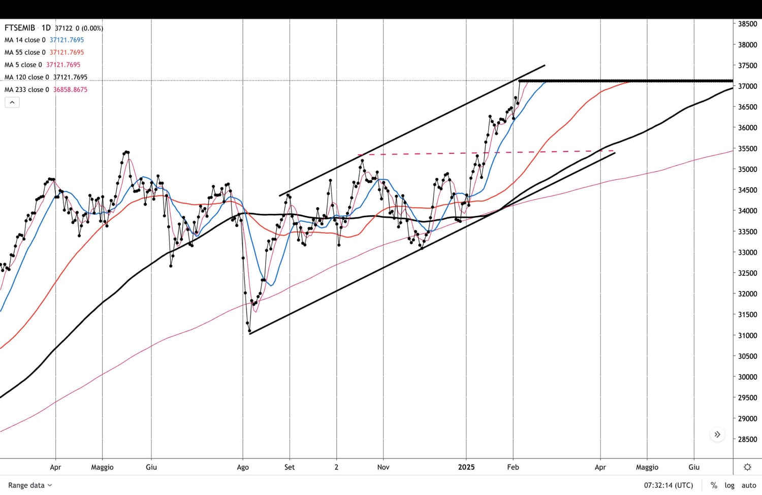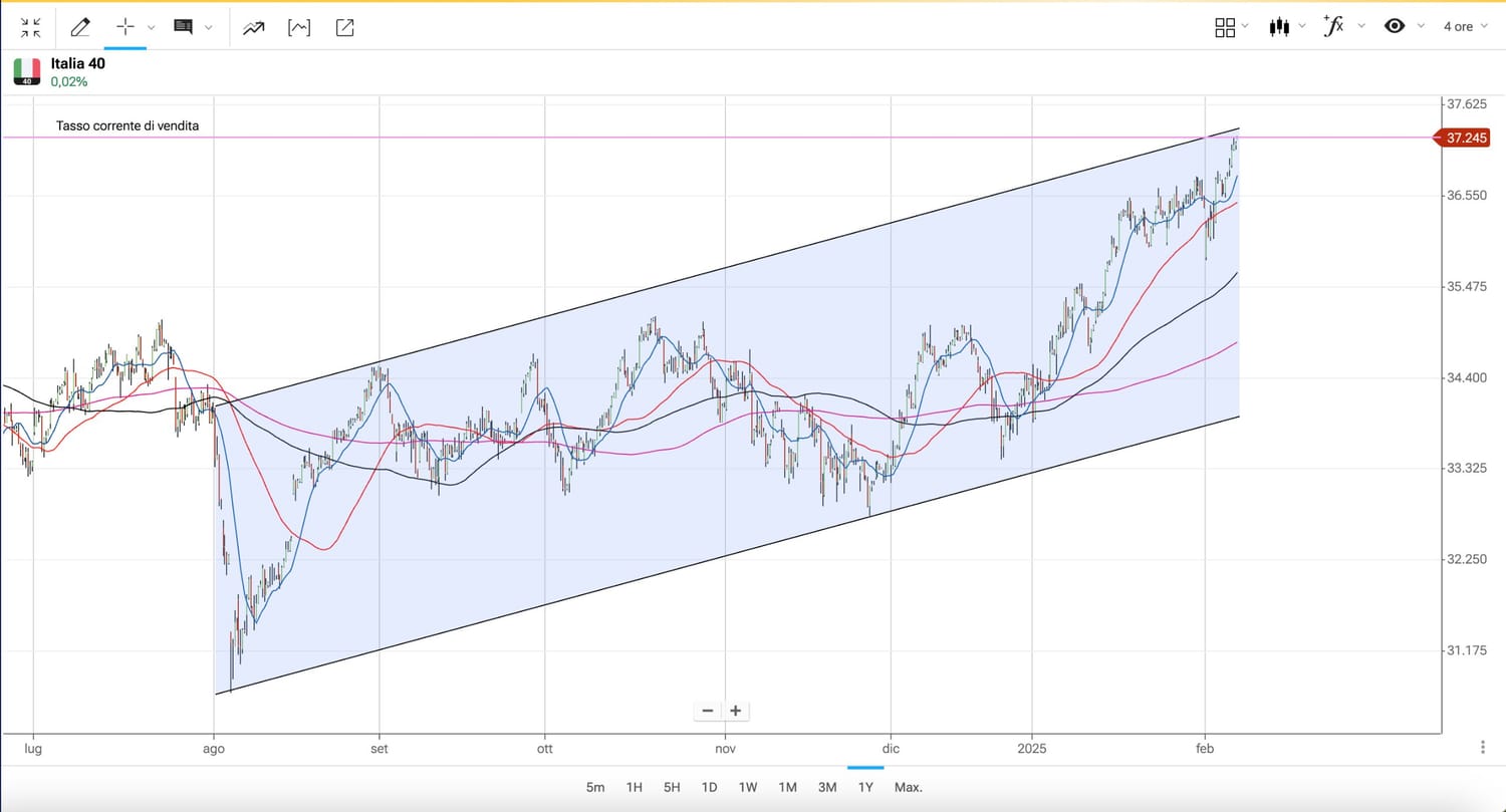 Nel grafico di fine giornata sul FTSE MIB osserviamo che i prezzi sono arrivati potenzialmente contro il bordo superiore del largo canale rialzista partito dai MINIMI di Agosto 2024.