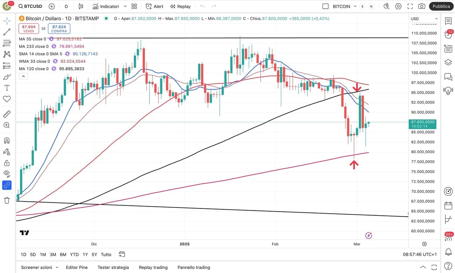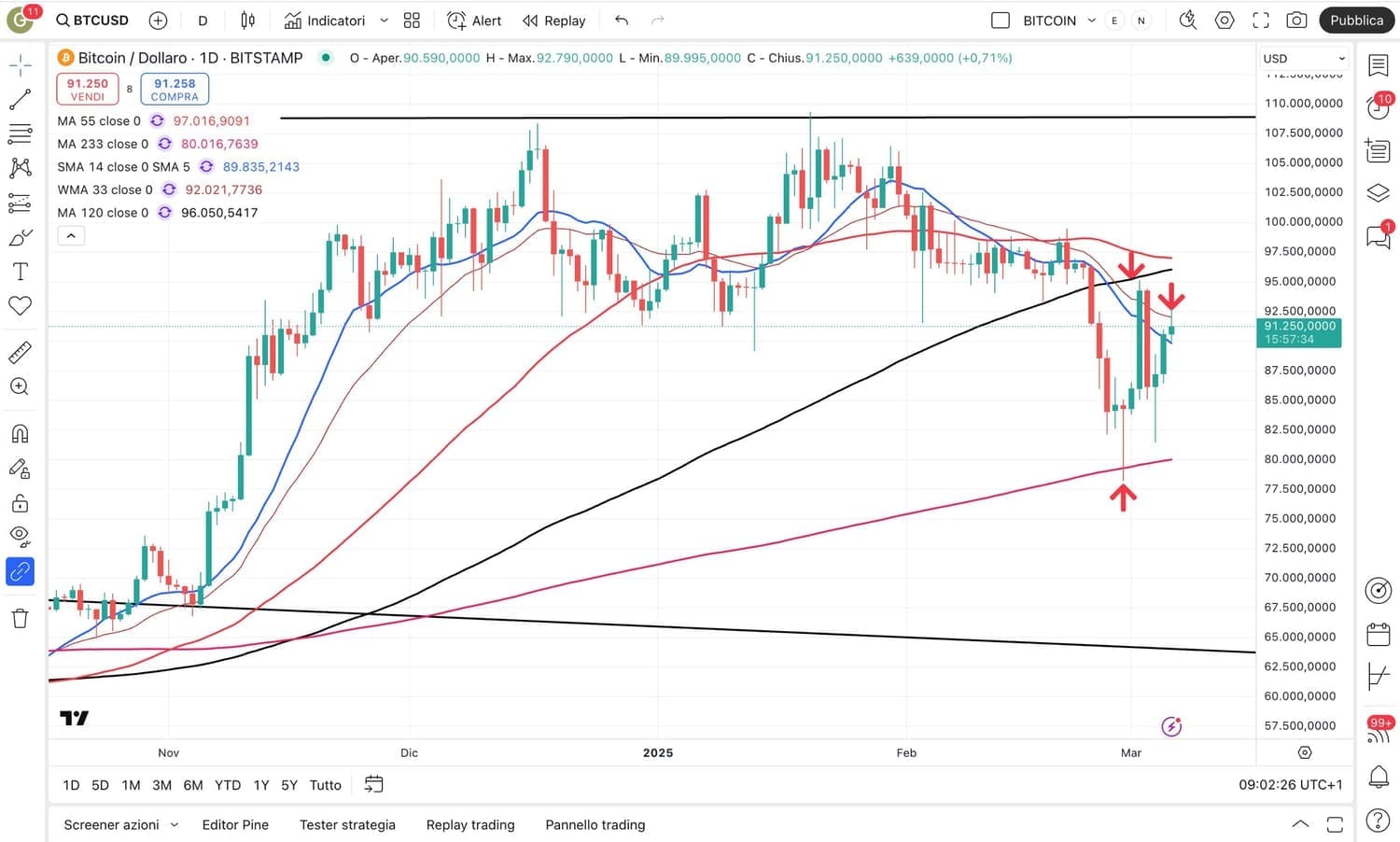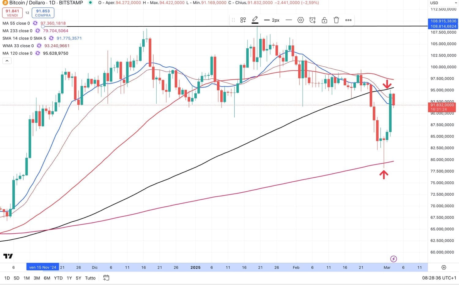 Nel week-end dunque è avvenuto un poderoso rimbalzo, che ha riportato il prezzo a testare la RESISTENZA attorno ai 95000 dollari, dove passava la MEDIA MOBILE nera a 120 periodi.