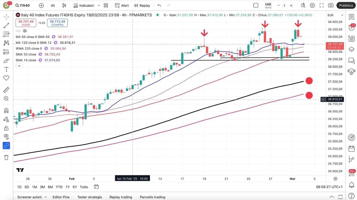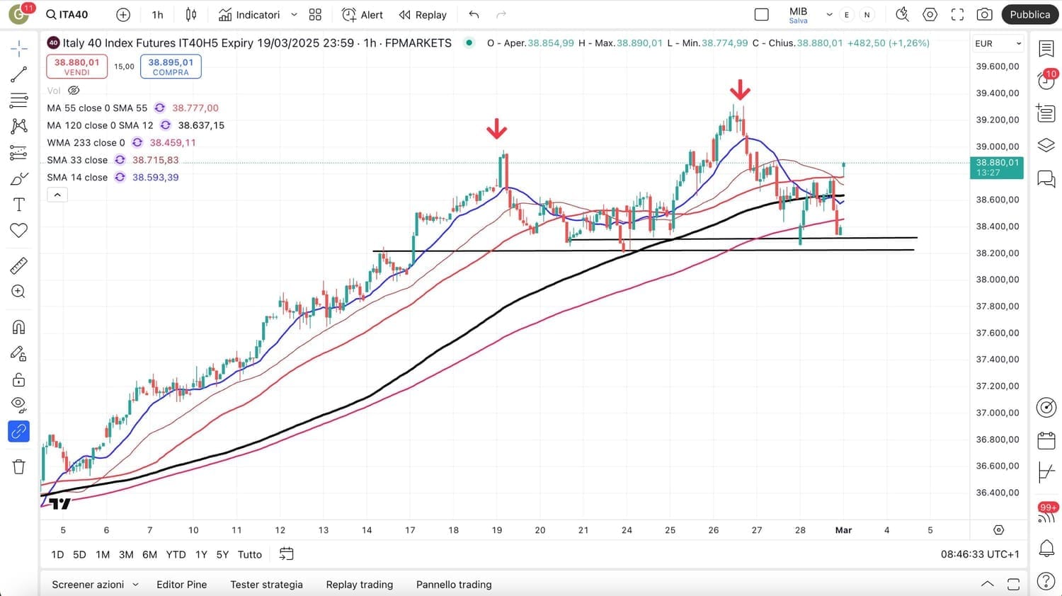 Come ipotizzato nel pomeriggio di ieri, poco dopo che era stato preso un TAKE PROFIT di ben 1300 punti sul MIB (che per qualcuno è stato anche di 1400-1500 punti) il prezzo è rimbalzato dal SUPPORTO di breve individuato a 37600 punti, risalendo addirittura di quasi 1000 punti !