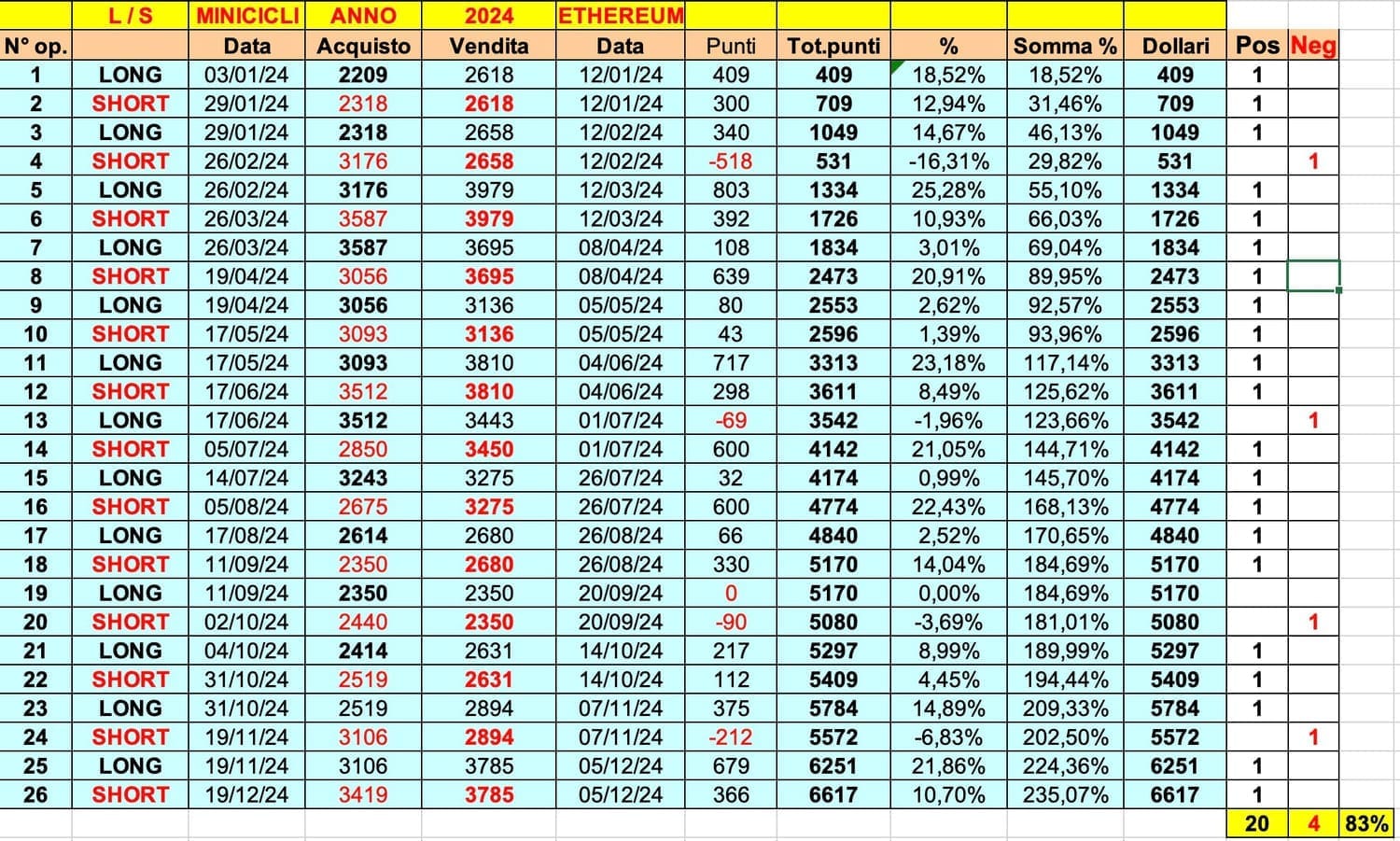 Parliamo quindi anche delle CRIPTOVALUTE BITCOIN ed ETHEREUM, su cui nel 2024 c’è stato un vero e proprio BOOM di risultati nell’applicazione dei MINICICLI, che rivediamo qui sotto su ETHEREUM…