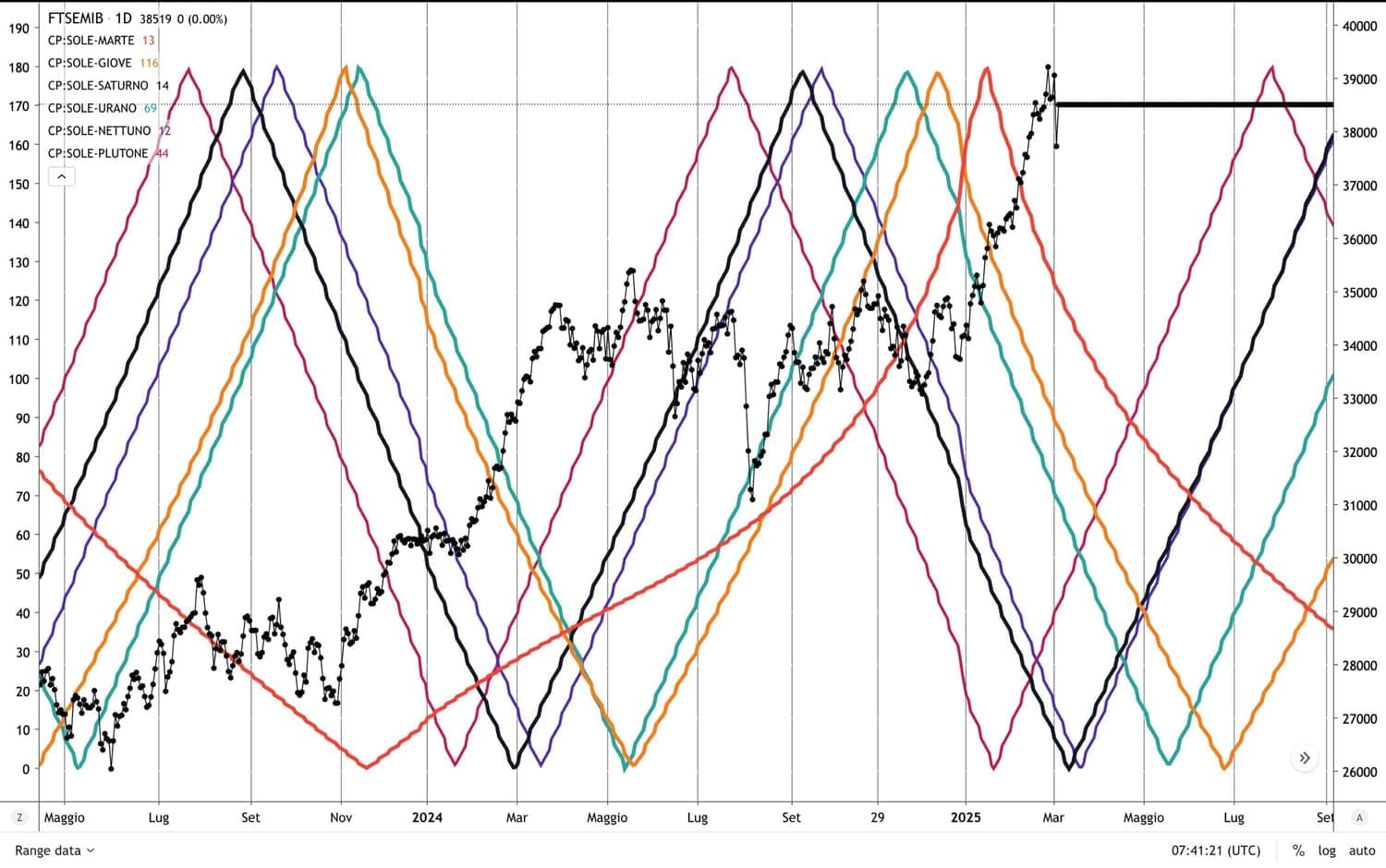 Dal punto di vista dei CICLI SOLARI, la salita del Ftse MIb (e degli indici europei in generale) ha seguito l’inclinazione del CICLO SOLE-MARTE da Novembre 2023 in poi (diventato discendente a metà Gennaio 2025).