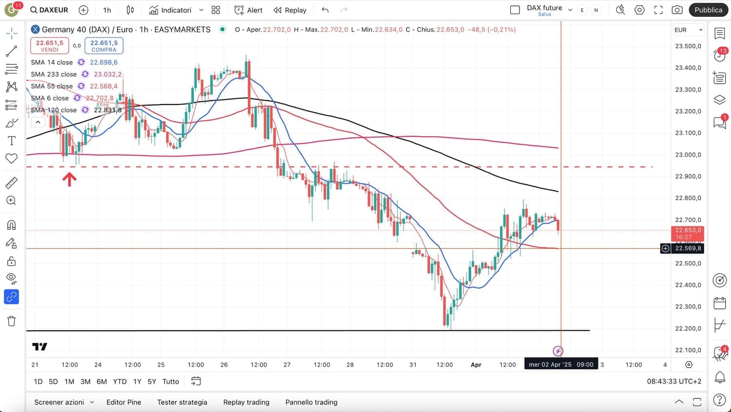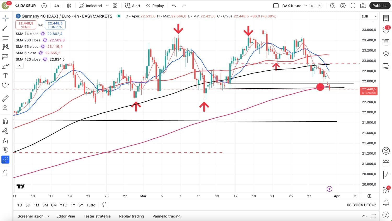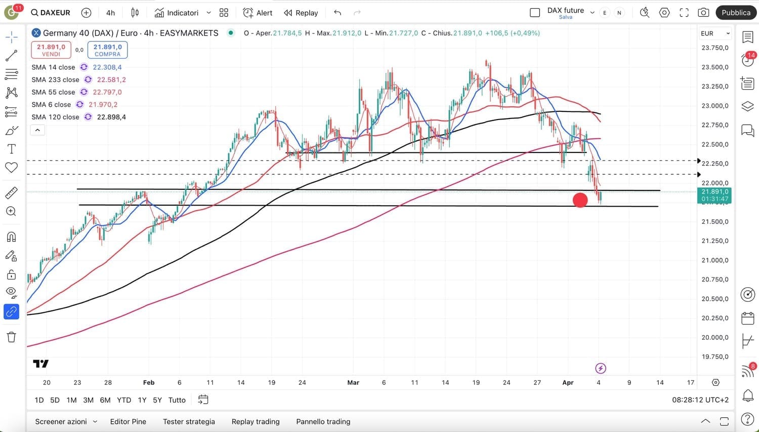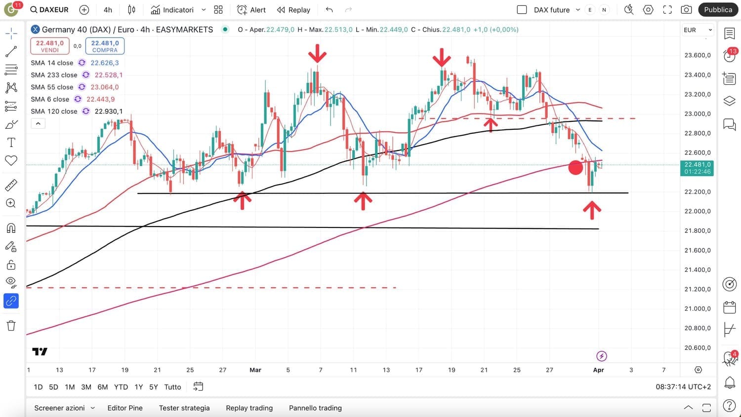 Il DAX sta testando esattamente la MEDIA MOBILE a 233 sul grafico a 4 ore, tra i 22400 e i 22500 punti.