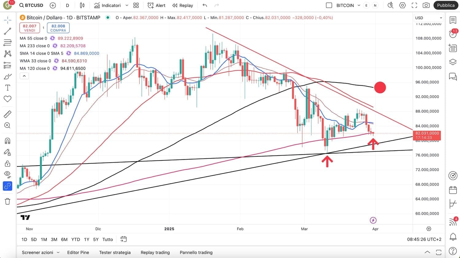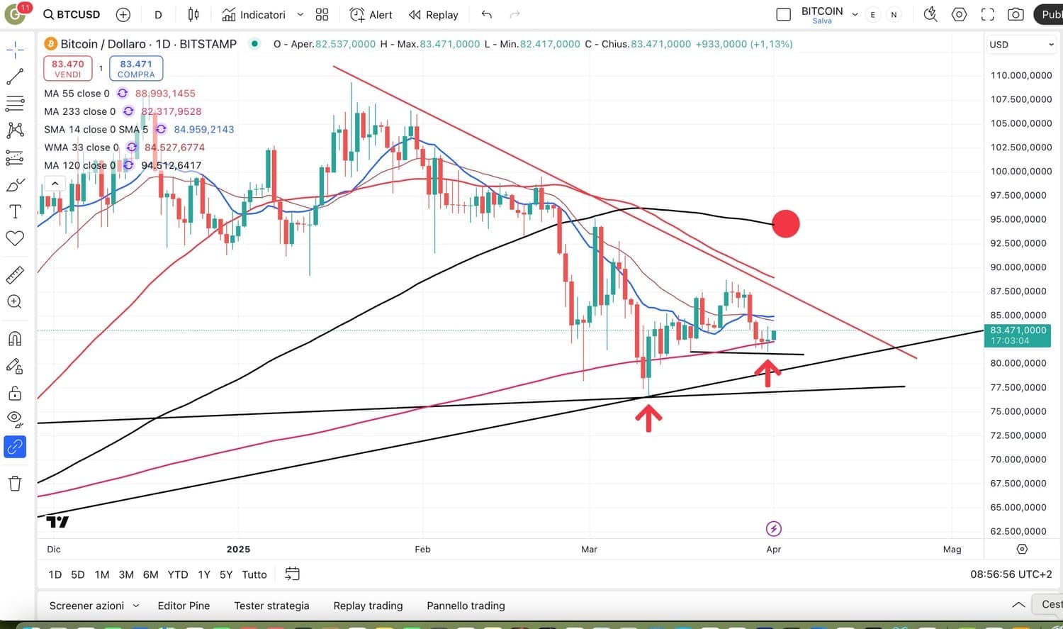 Ieri infatti si è formato un doppio MINIMO attorno agli 81000-81500 dollari, livello che era stato raggiunto il 18 Marzo prima della risalita.