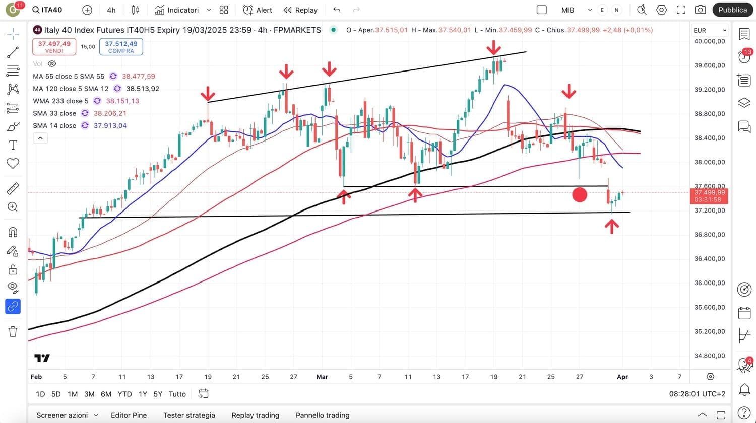 Non escluderei quindi che si possa anche tornare verso i MINIMI di Lunedì (che erano stati fatti attorno ai 37100-37200 punti,) qualora vi fosse un peggioramento della situazione internazionale per via dei DAZI.