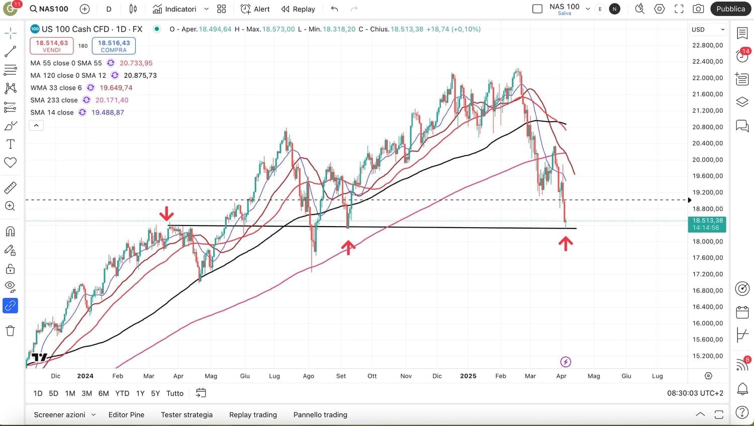Davvero potente la candela rossa del NASDAQ 100 ieri sera, passato da 19800 a 18800 punti (-1000 punti) in meno di due ore.
