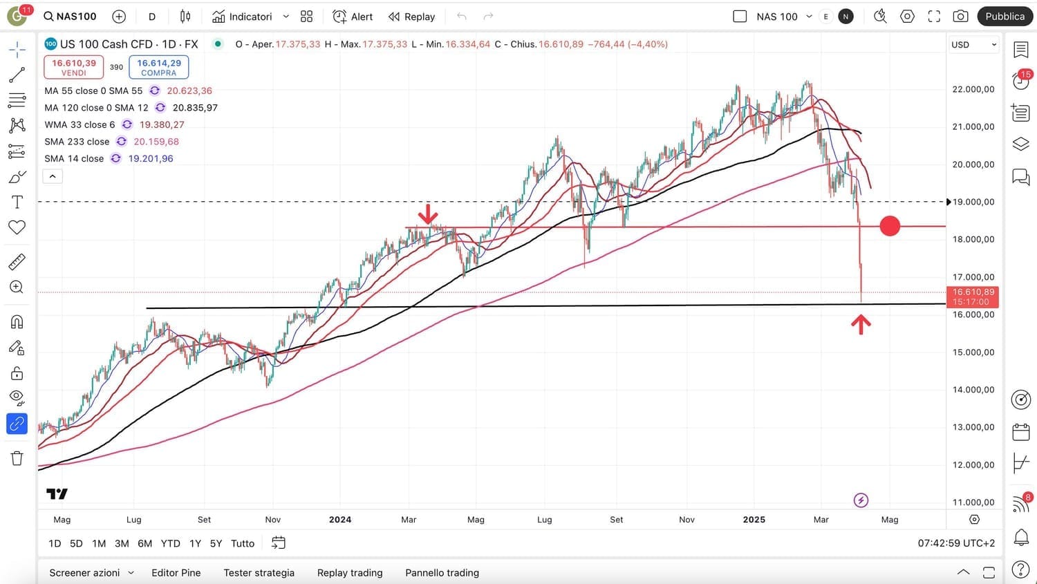 Qui sotto dunque il NASDAQ 100, ora attorno ai 16700-16800 punti circa.