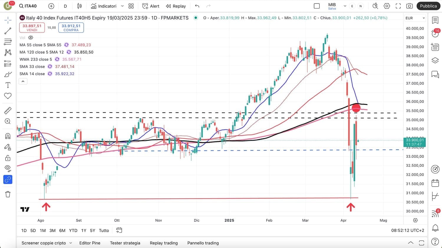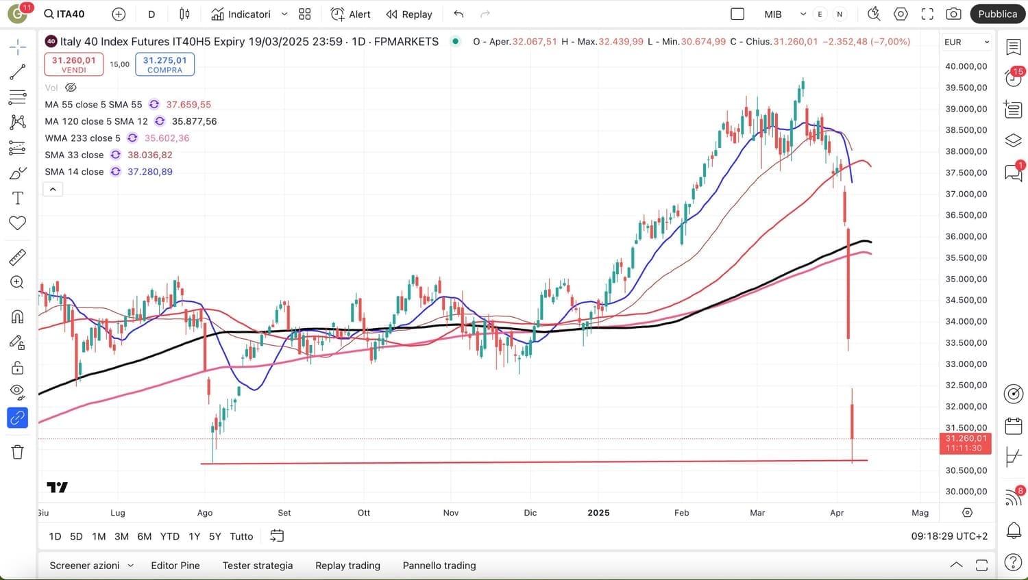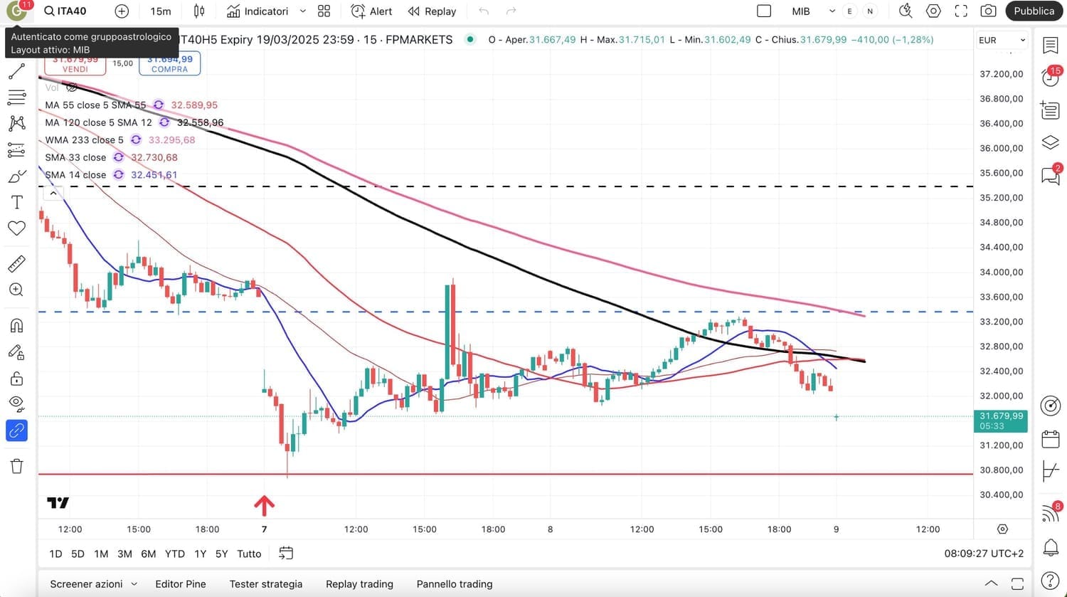 Riprendo dunque l’analisi dopo la fortissima apertura negativa delle ore 9,00, che però ci mostra il livello raggiunto dal MIB future, proprio sui MINIMI di Agosto 2024 attorno ai 31000 punti.