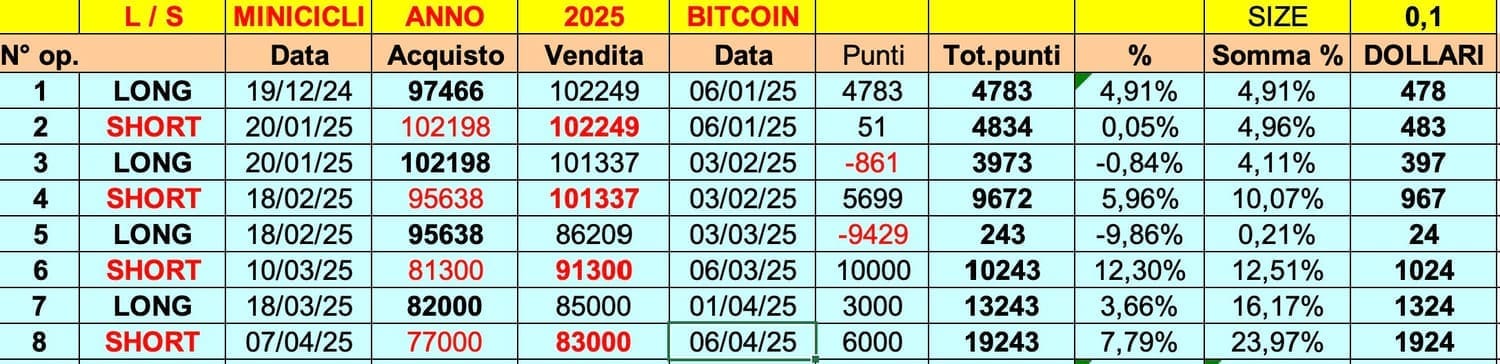 Possiamo sintetizzare così il riepilogo dei risultati su BITCOIN.