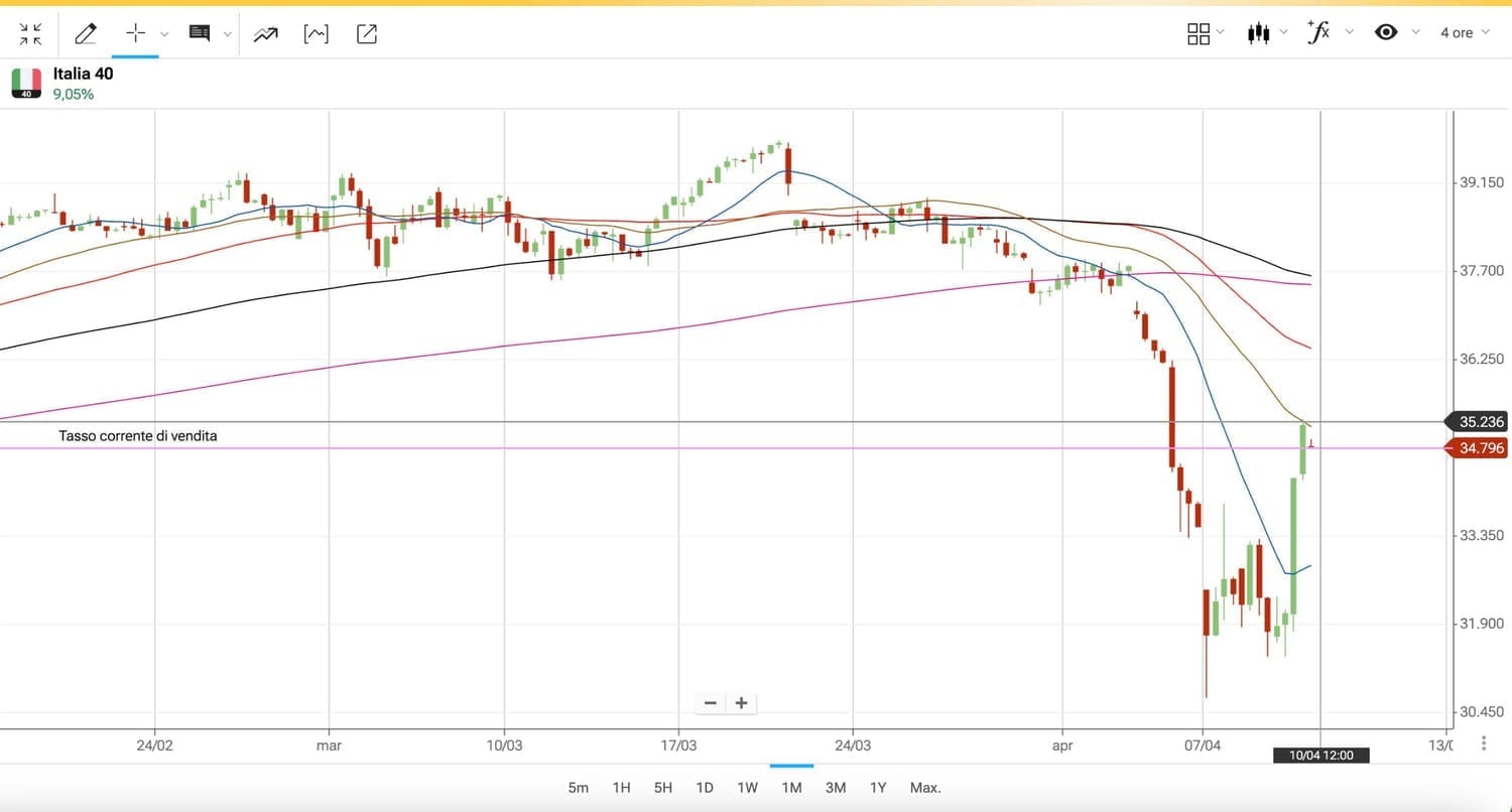Alla notizia della sospensione dei DAZI per 90 giorni da parte di TRUMP, ieri pomeriggio, i mercati sono risaliti in modo vertiginoso, confermando le ipotesi fatte già da Lunedì, con il MIB che effettivamente è ritornato sopra i 35000 punti.