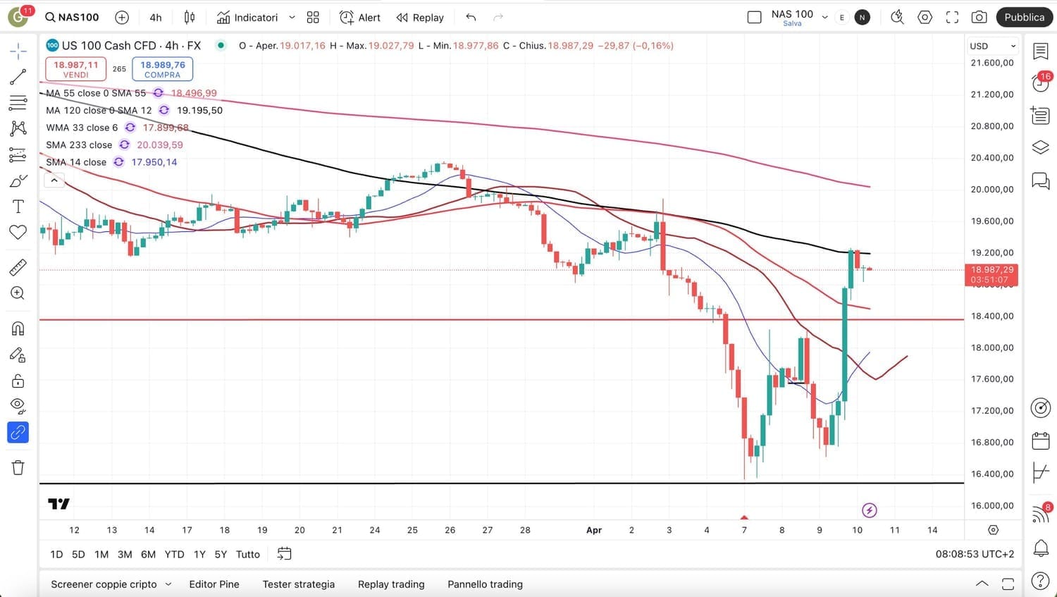 Ieri alle ore 18,00 circa sul SUPPORTO a 18000 punti è partita la risalita mentre ora ci troviamo già in una zona di RESISTENZA attorno ai 18800 punti.