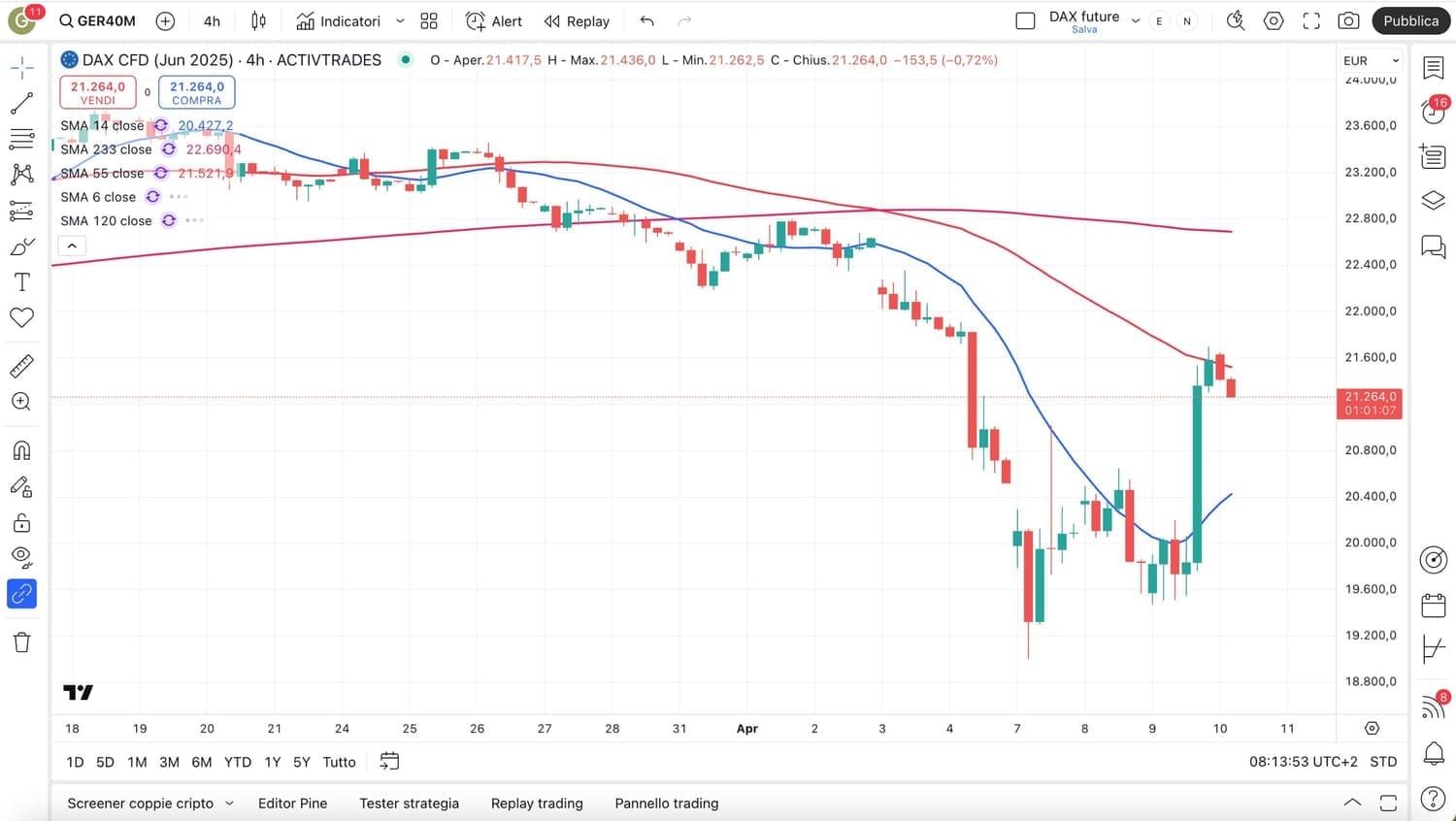 Un’occhiata al DAX salito fino 21700 punti ed ora a 21300 punti circa.