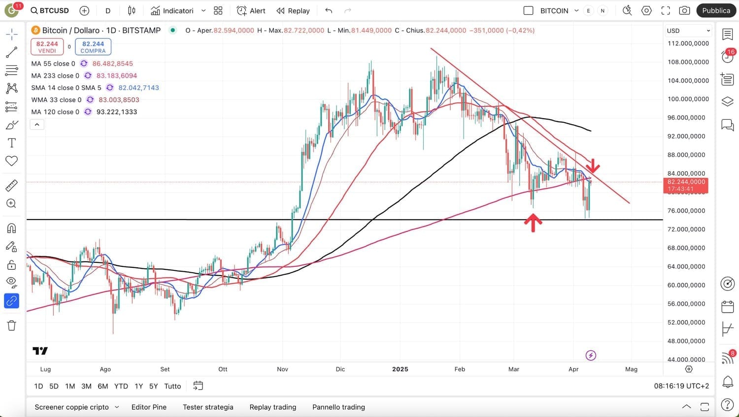 La notizia sui DAZI ha permesso la risalita di BITCOIN, tornato sopra gli 82000 dollari (complimenti a LUCA, che era entrato al RIALZO a 77000 dollari e ha colto tutto il movimento).