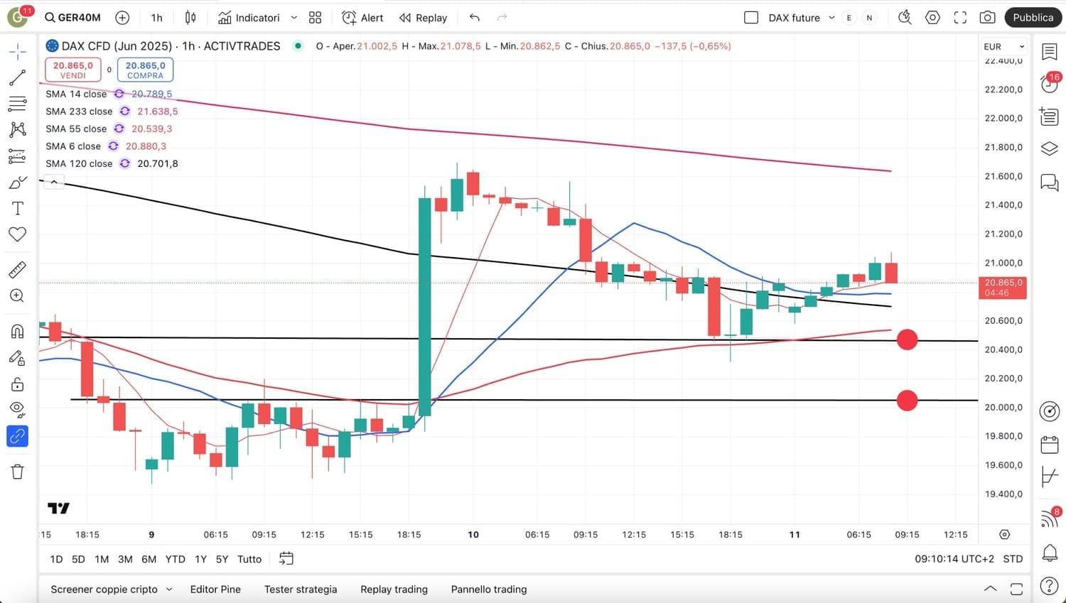 Lo stesso discorso potrebbe valere per il DAX qualora non tenessero gli attuali livelli e non si andasse sopra la RESISTENZA di stamattina attorno ai 21050-21100 punti.