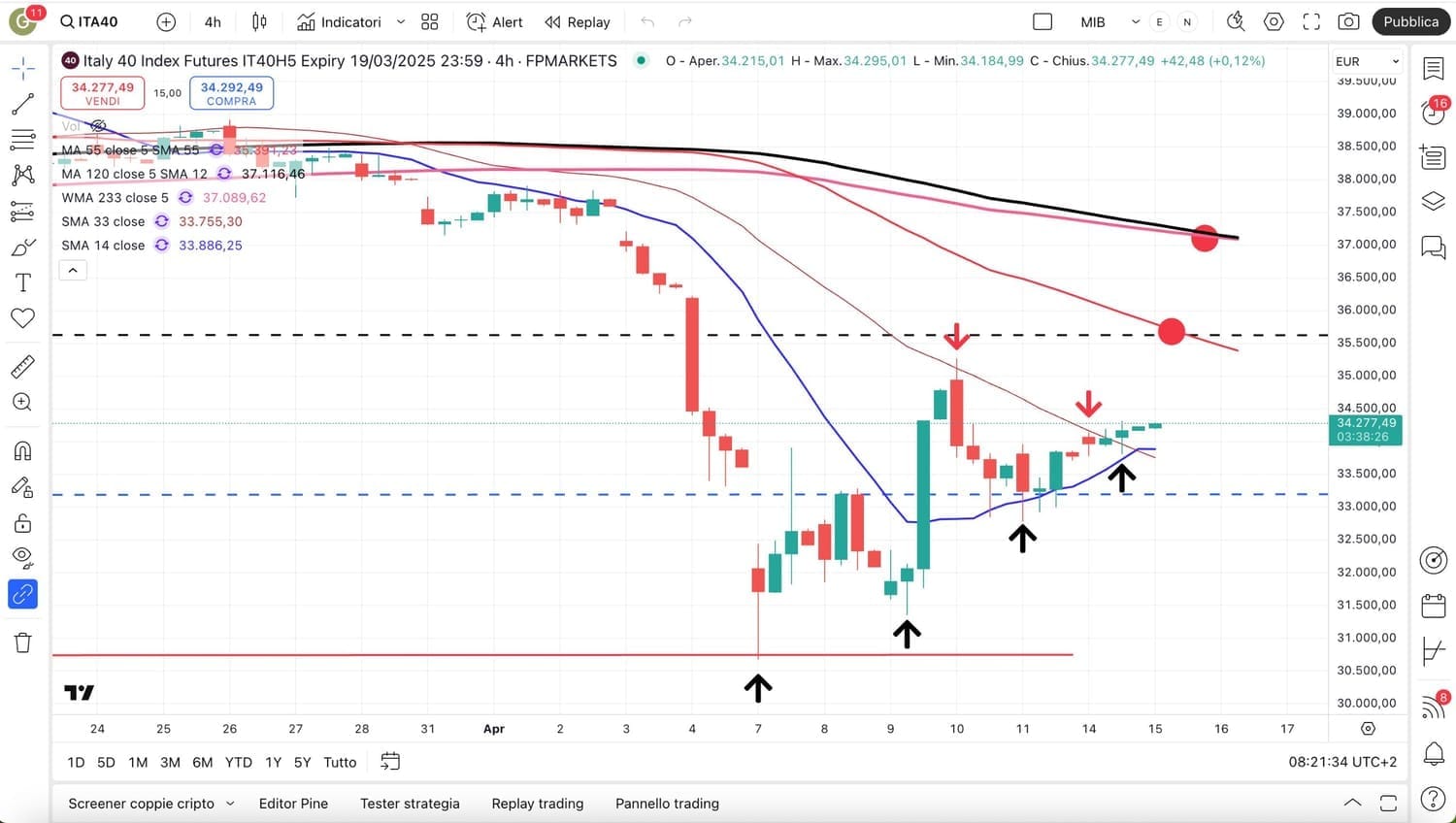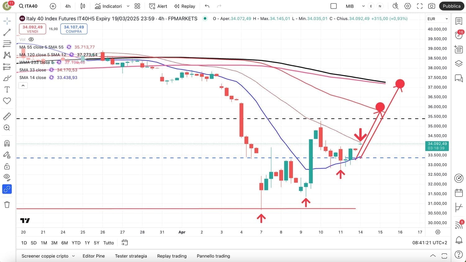 Se viene confermata la struttura a MININI crescenti a partire dal MINIMO profondo del 7 Aprile, il MIB future avrebbe un primo importante obiettivo rialzista verso i 35000-35500 punti, laddove è già stato fatto un MASSIMO veloce intraday il giorno 10 Aprile.