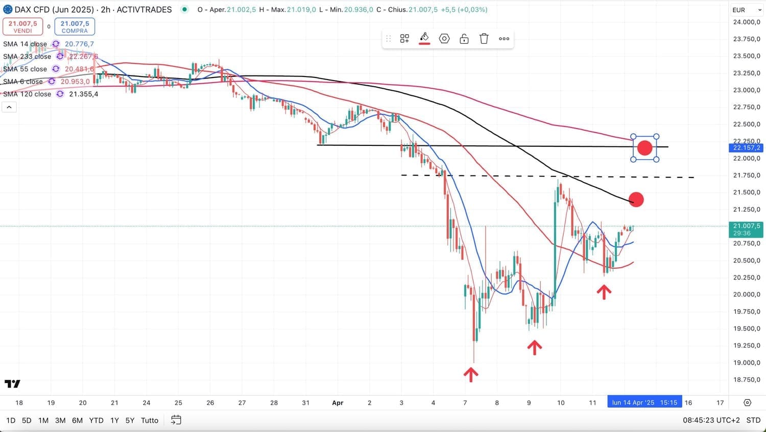 Allo stesso modo si può considerare il DAX dai 20320 punti di Venerdì 11 Aprile ai 21420 punti di ieri (+1100 punti al rialzo).