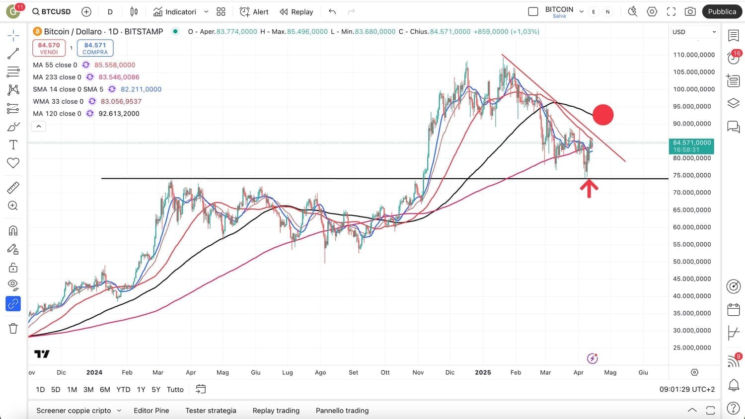 Fondamentale dunque la tenuta del SUPPORTO a 75000 dollari, che coincideva con il precedente MASSIMO di MARZO 2024 (un anno fa).