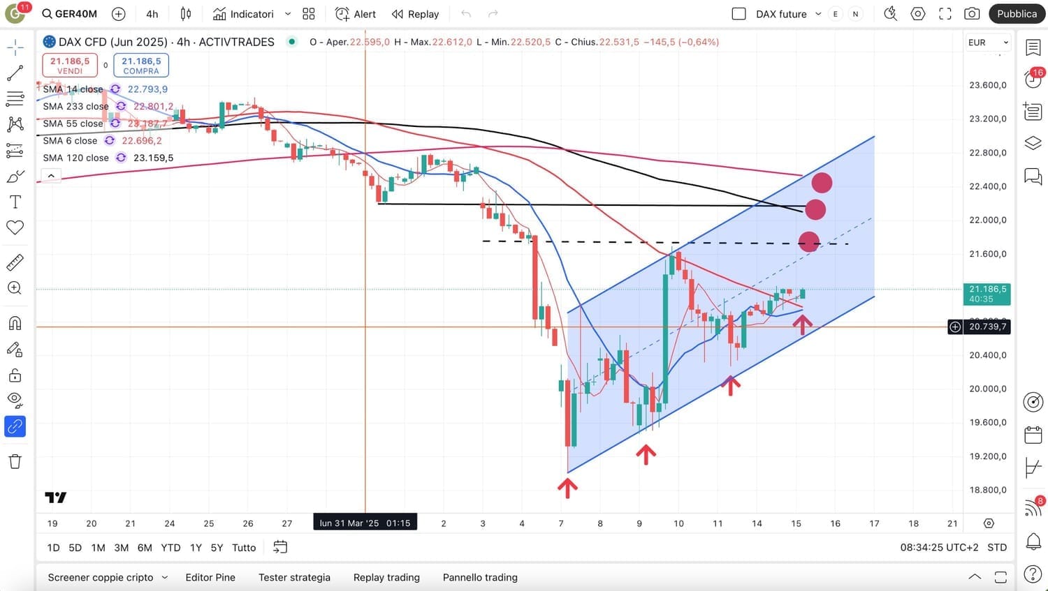 Qui sopra un grafico semplificato dove l’ipotesi principale è il possibile ritorno del DAX, che attualmente si trova a 21550 punti, verso i 20800-21000 punti, peraltro sfiorati ieri per ben due volte.
