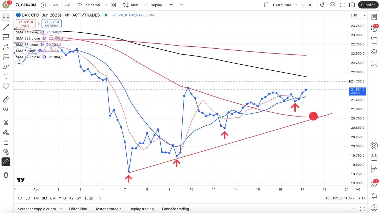 Possiamo considerare come un’unica operazione quella partita da Venerdì 11 Aprile da 32850 punti, ai 35050 di ieri (in pratica +2200 punti fatti al rialzo).