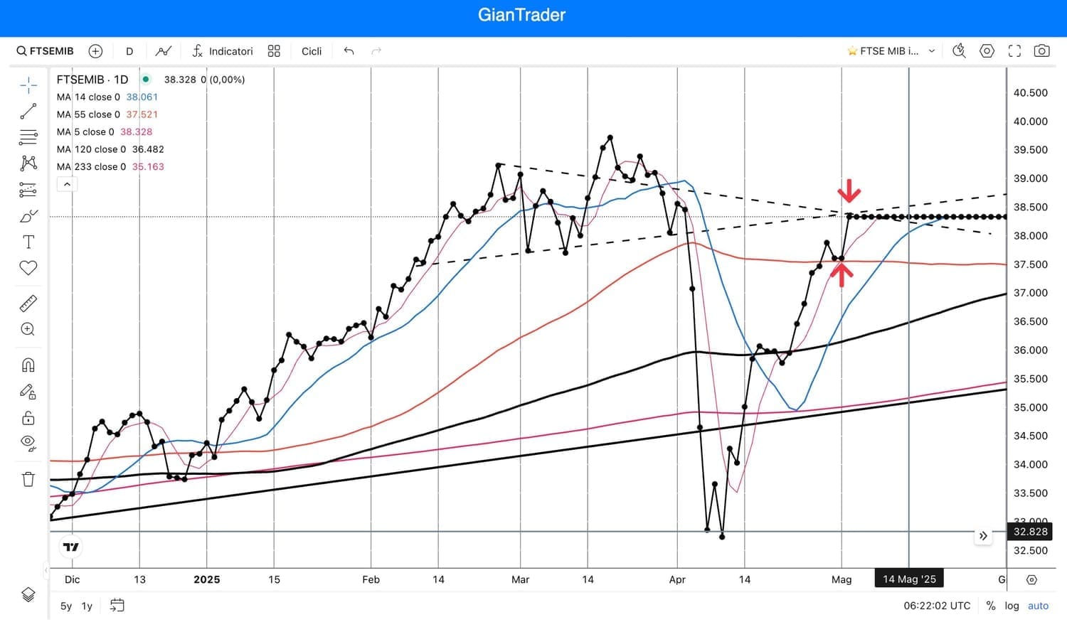 Saremmo arrivati su un “incrocio” di rette che potrebbe fungere da temporanea resistenza, con i valori del nostro indice tornati incredibilmente attorno ai 38500 punti.