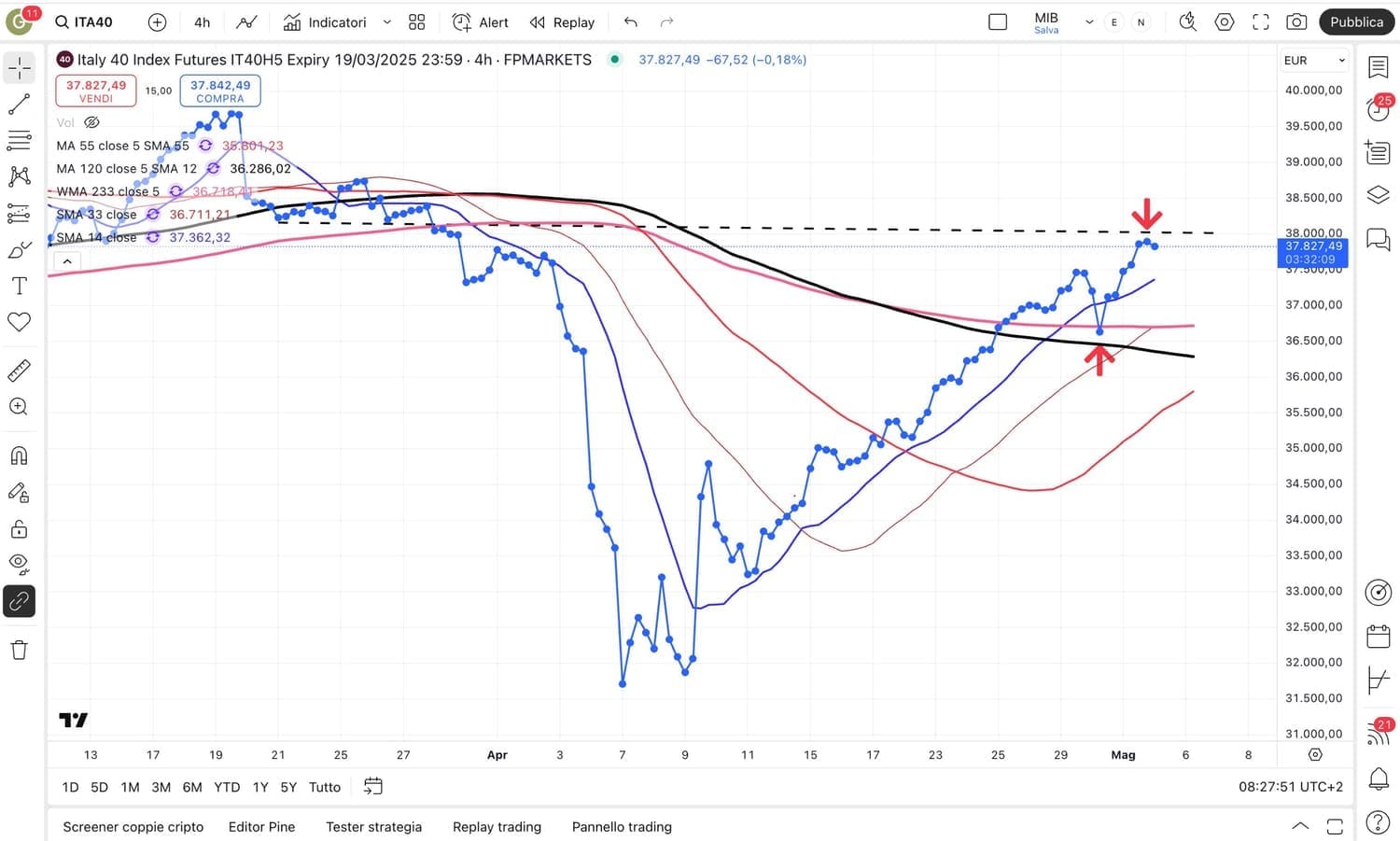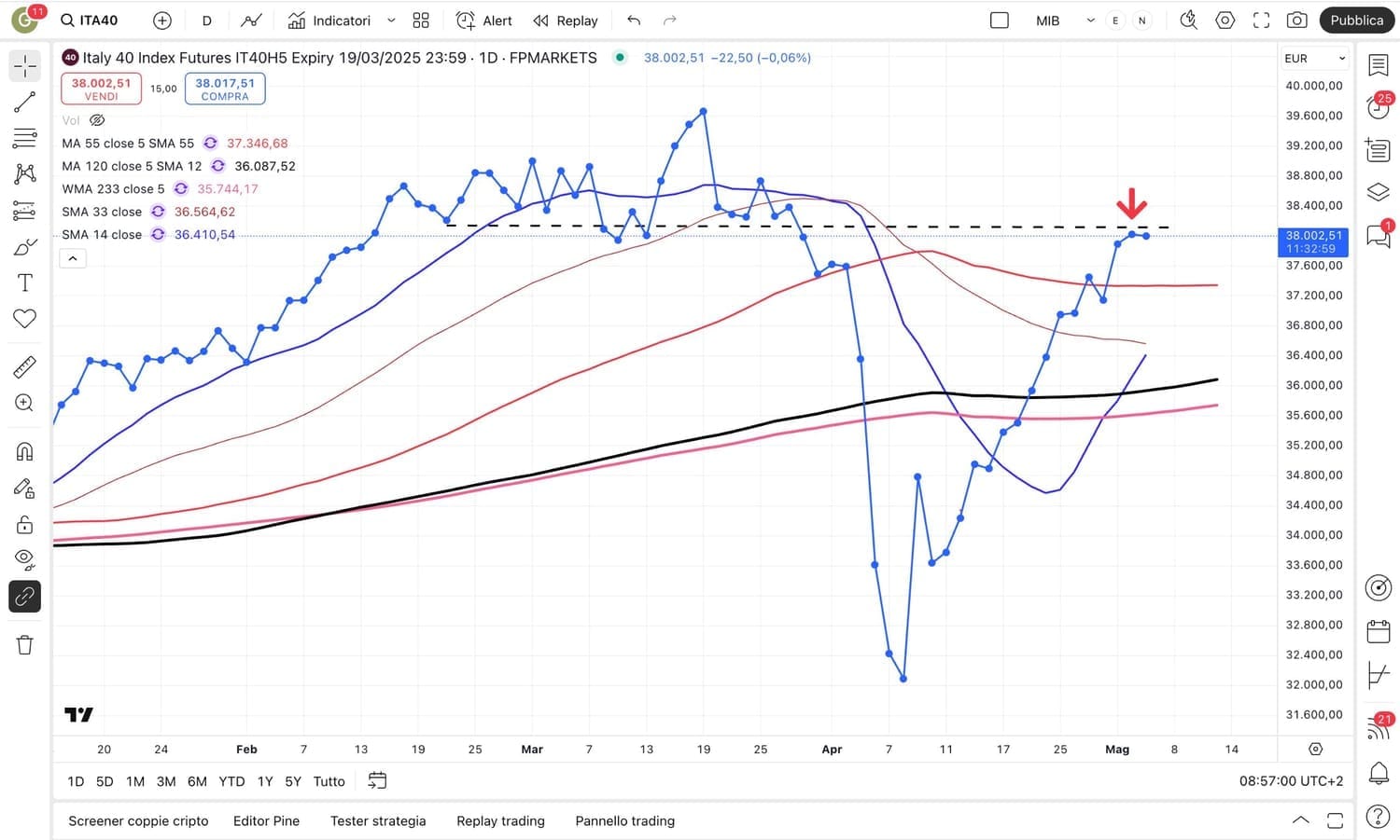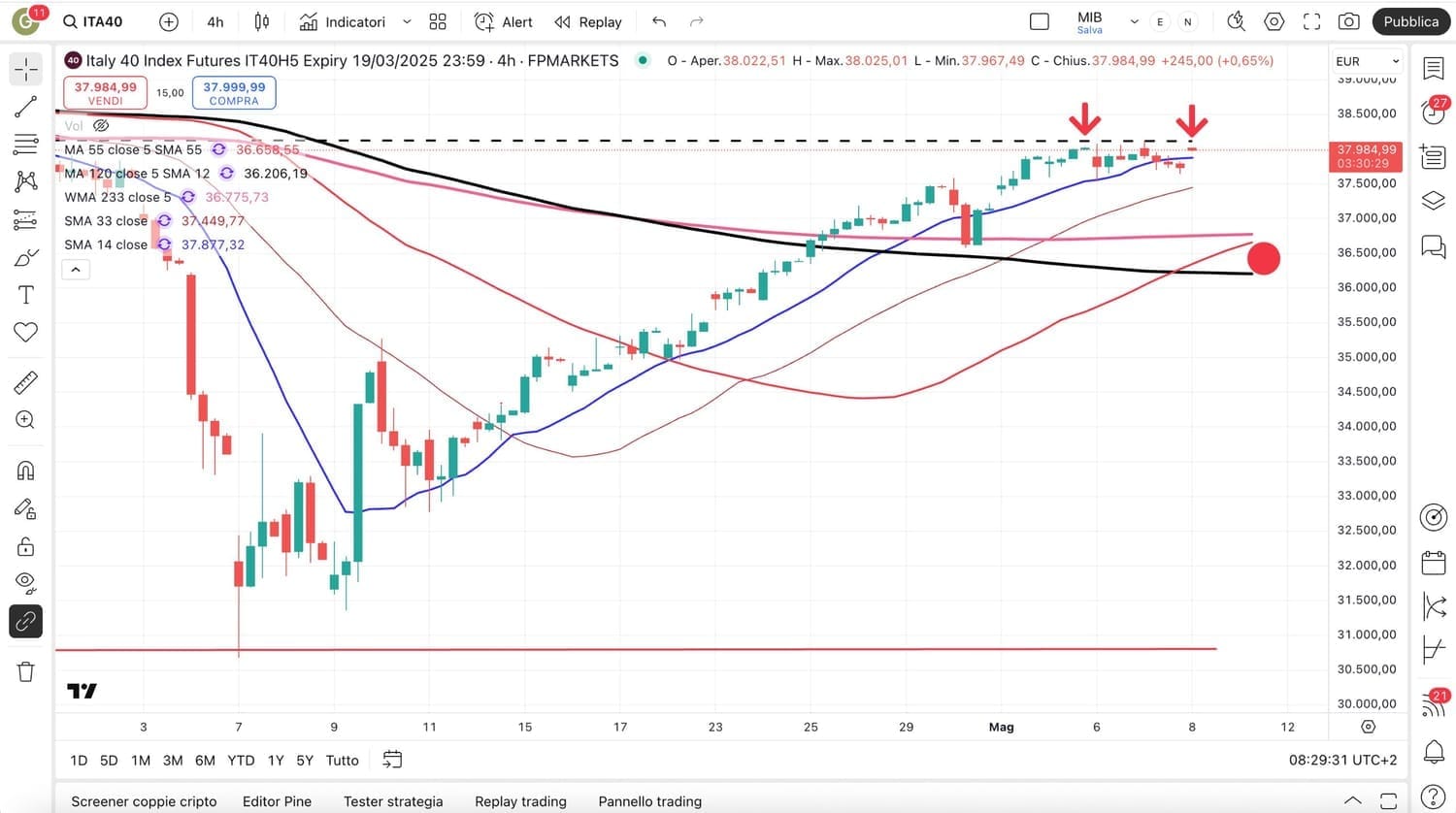 Per quanto riguarda il MIB future italiano ieri si è verificata un’oscillazione verso il basso che era arrivata sotto i 37600 punti, poi recuperata in serata (ora siamo attorno ai 37900 punti circa).