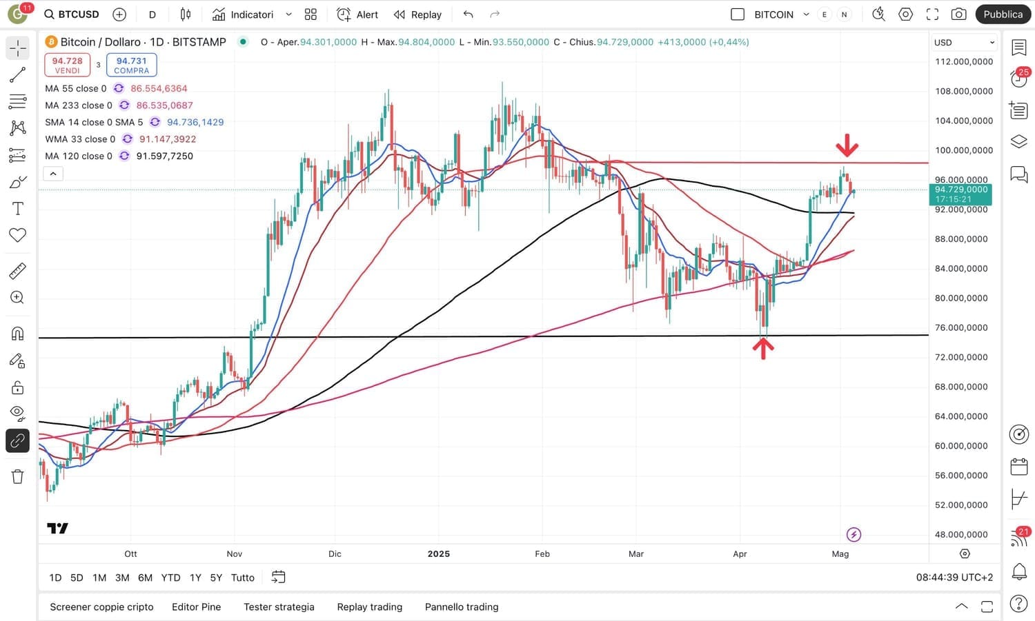 Riprendiamo anche il BITCOIN ora attorno ai 94500 dollari.