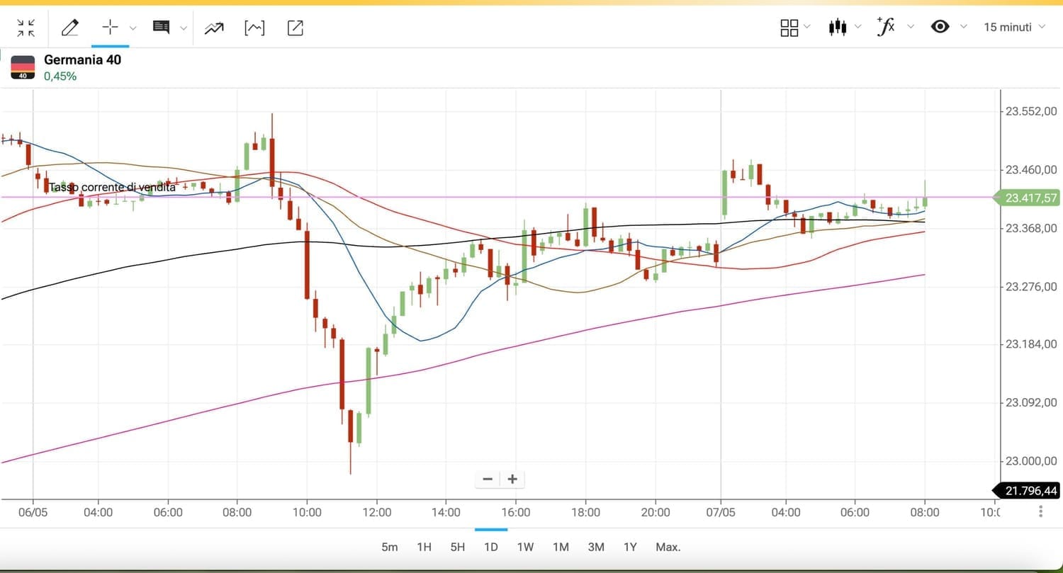 Tutto da rifare sul DAX future, che ieri era sceso di oltre 550 punti (da 23550 fin sotto i 23000 punti) per poi recuperare agli attuali 23400 punti circa.