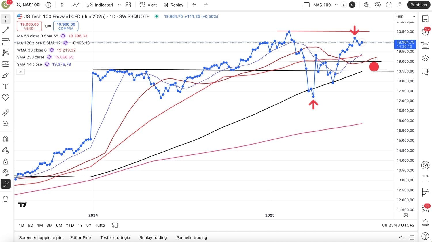 Il NASDAQ 100, tornando sopra i 20000 punti si è riavvicinato ai massimi di MARZO, pur rimanendo leggermente sotto.