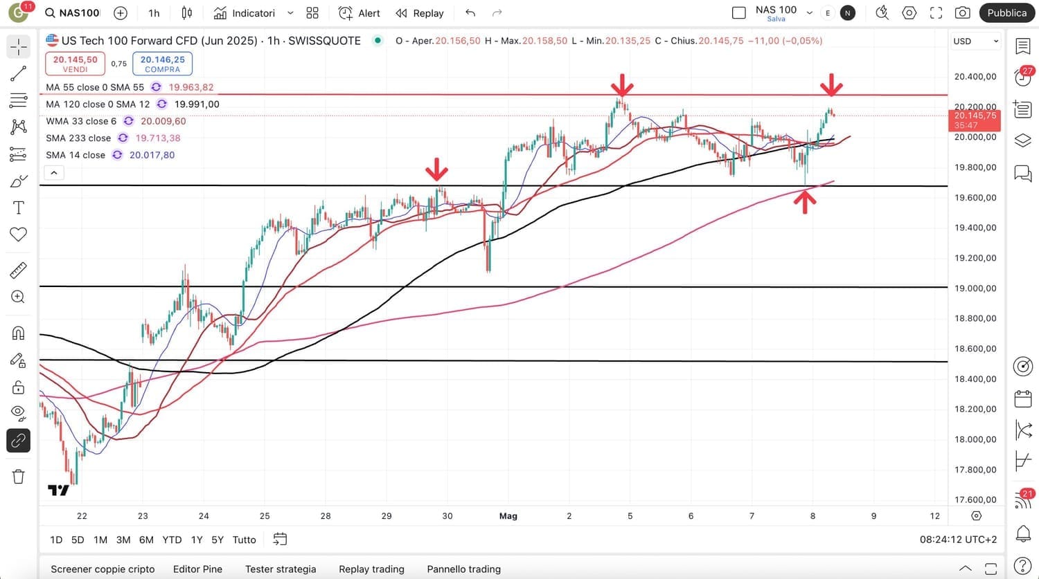 Un’occhiata anche al NASDAQ 100, ancora nei pressi della soglia dei 20000 punti dopo il tentativo di discesa di ieri poi parzialmente recuperato.