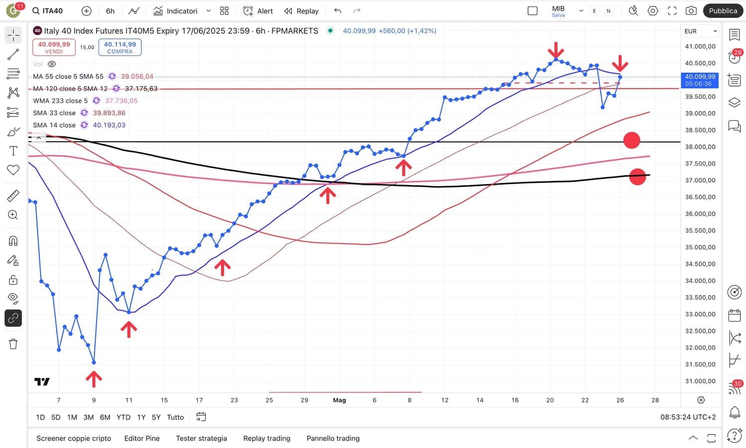 Il MIB ha trovato un SUPPORTO attorno ai 23900 punti ed ora si trova attorno ai 40100-40150 punti.