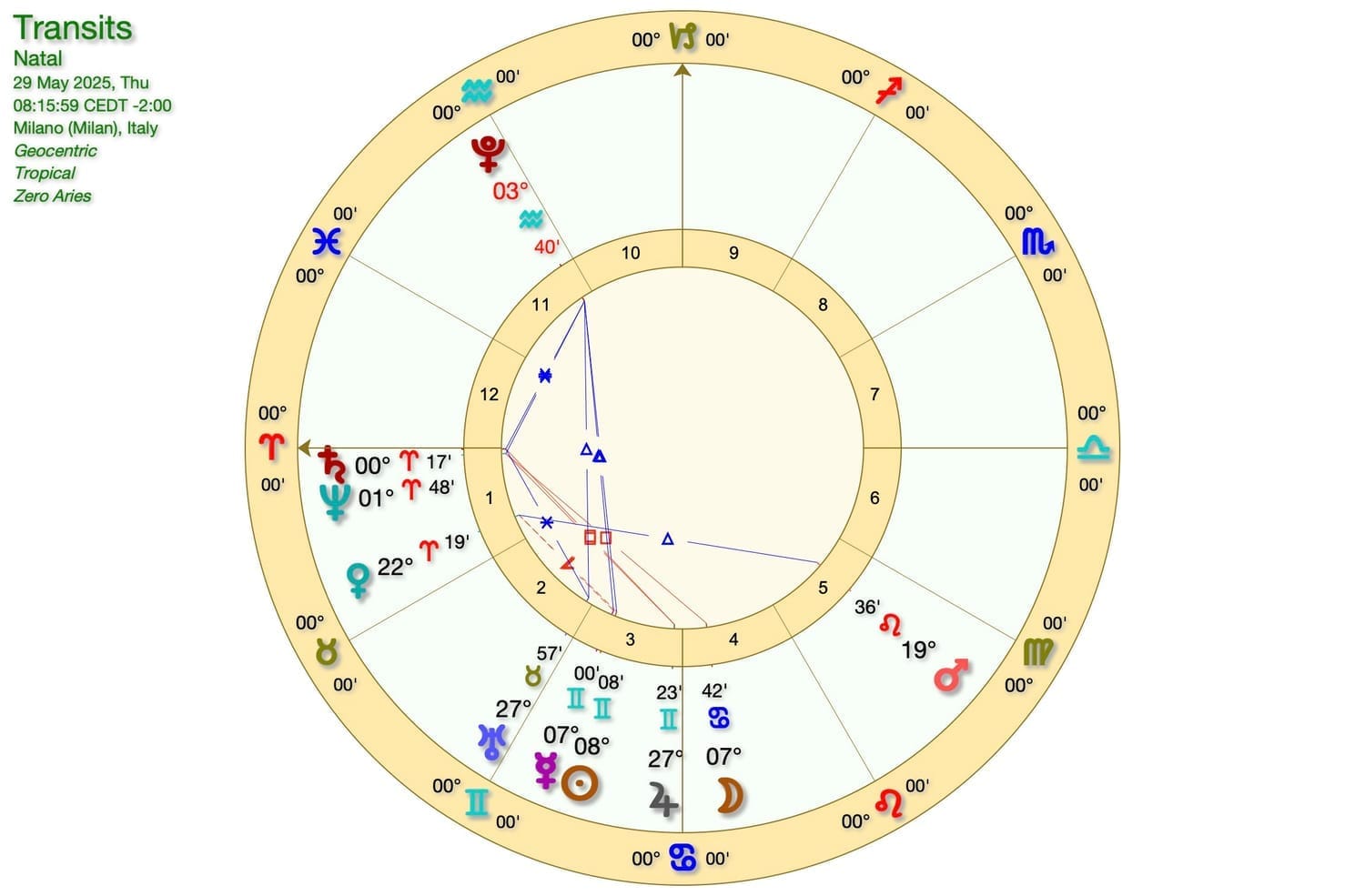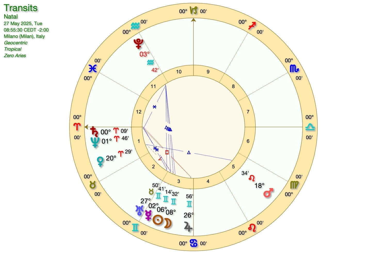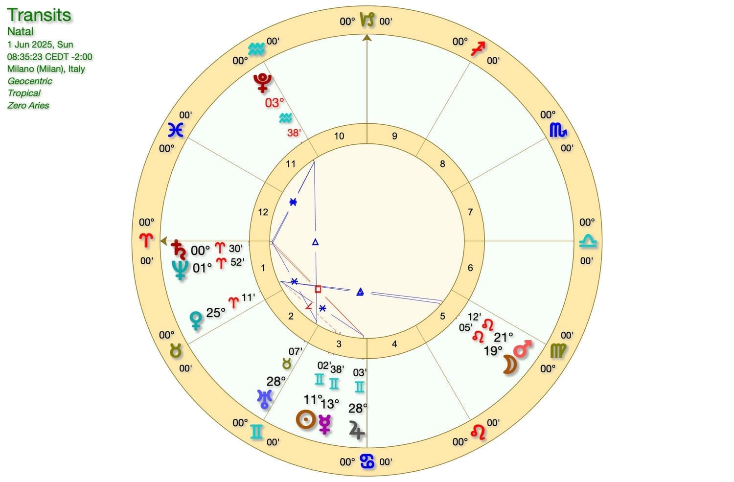 Questa è la configurazione già citata di Domenica 1° GIugno, con la CONGIUNZIONE LUNA-MARTE in LEONE al TRIGONO di VENERE in ARIETE.