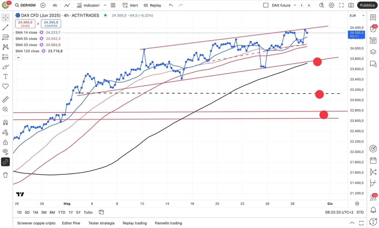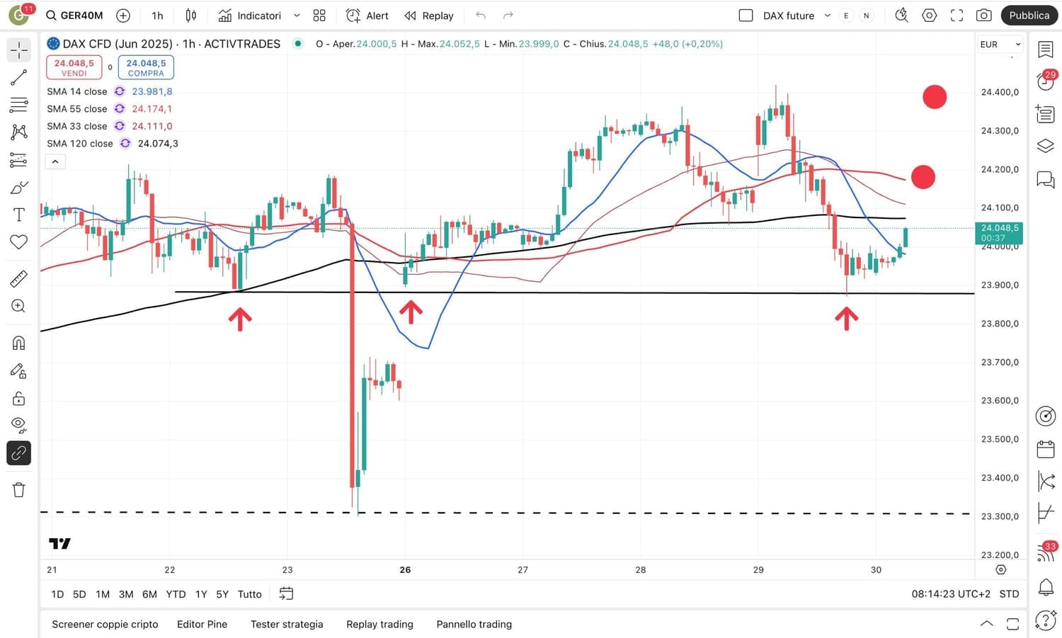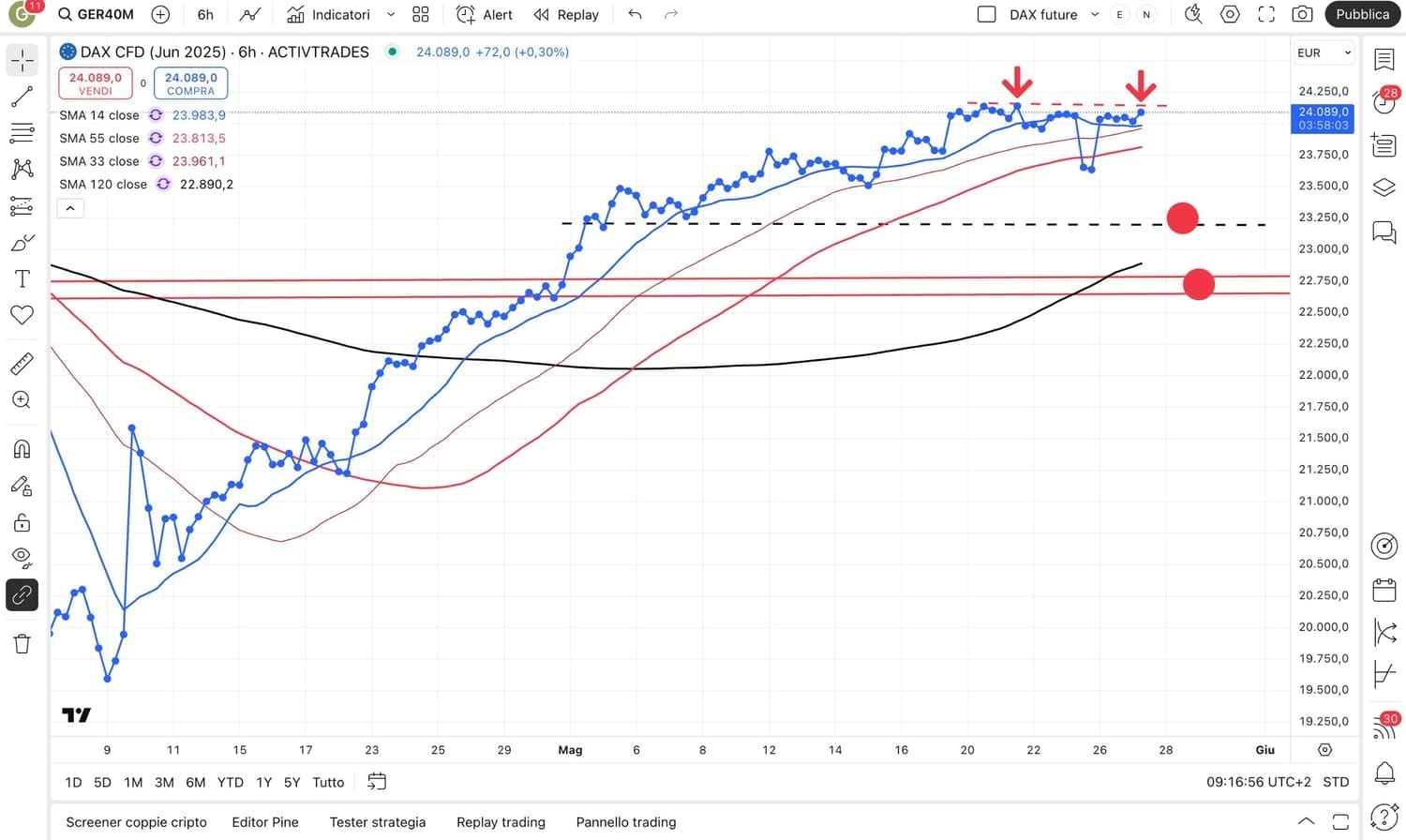 Il DAX ha trovato ieri pomeriggio un SUPPORTO di breve attorno ai 23900 punti e sta tentando il rimbalzo…