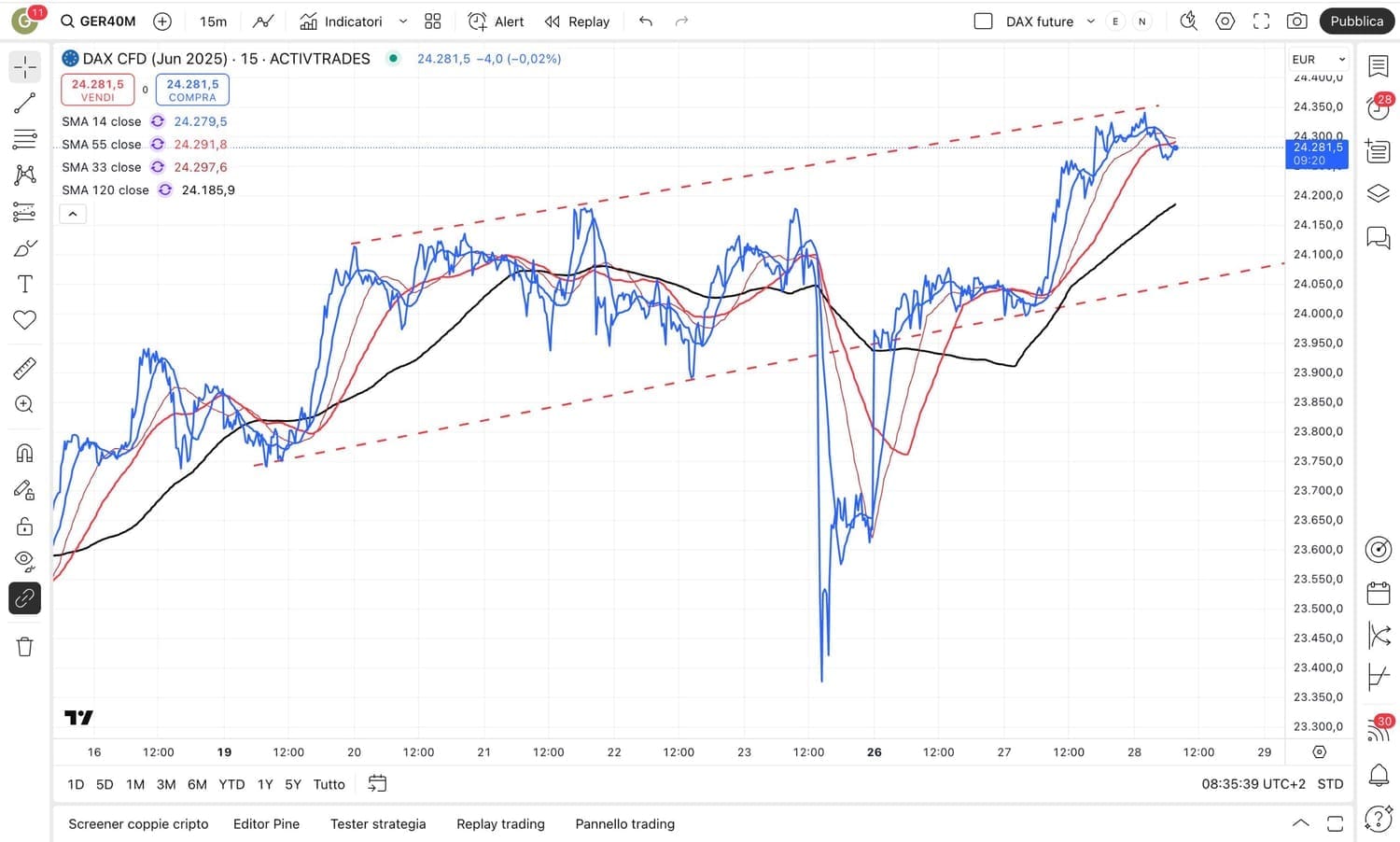ll DAX ha fatto un nuovo massimo sopra i 24400 punti mentre ora è sceso leggermente verso i 24300 punti.
