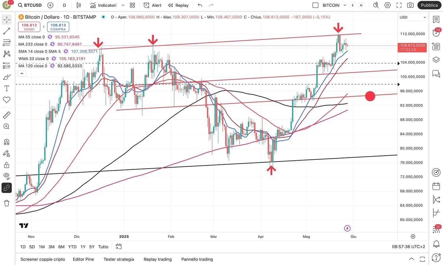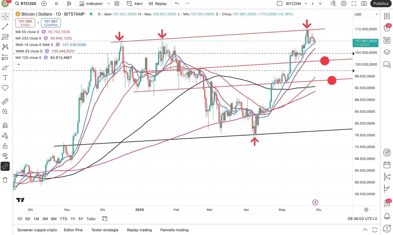 Analizziamo la situazione su BITCOIN che sta oscillando tra i 107000 e i 109000-110000 dollari.