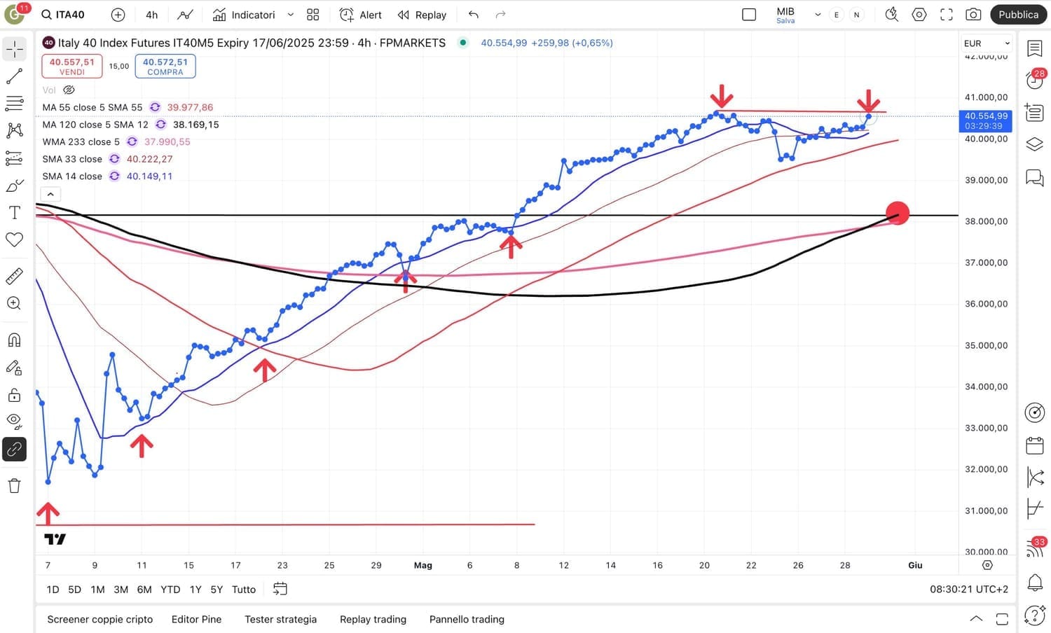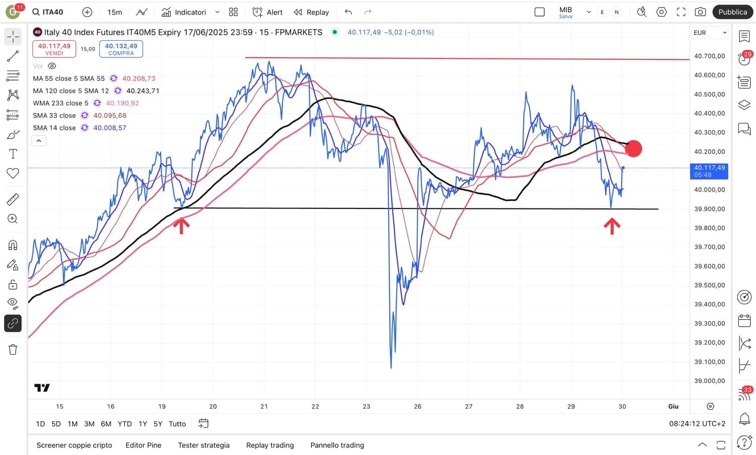 Passiamo ora al MIB italiano, che dopo un massimo attorno ai 40350 punti era sceso nuovamente a 40100 per poi risalire attorno ai 40200 punti dove si trova ora.
