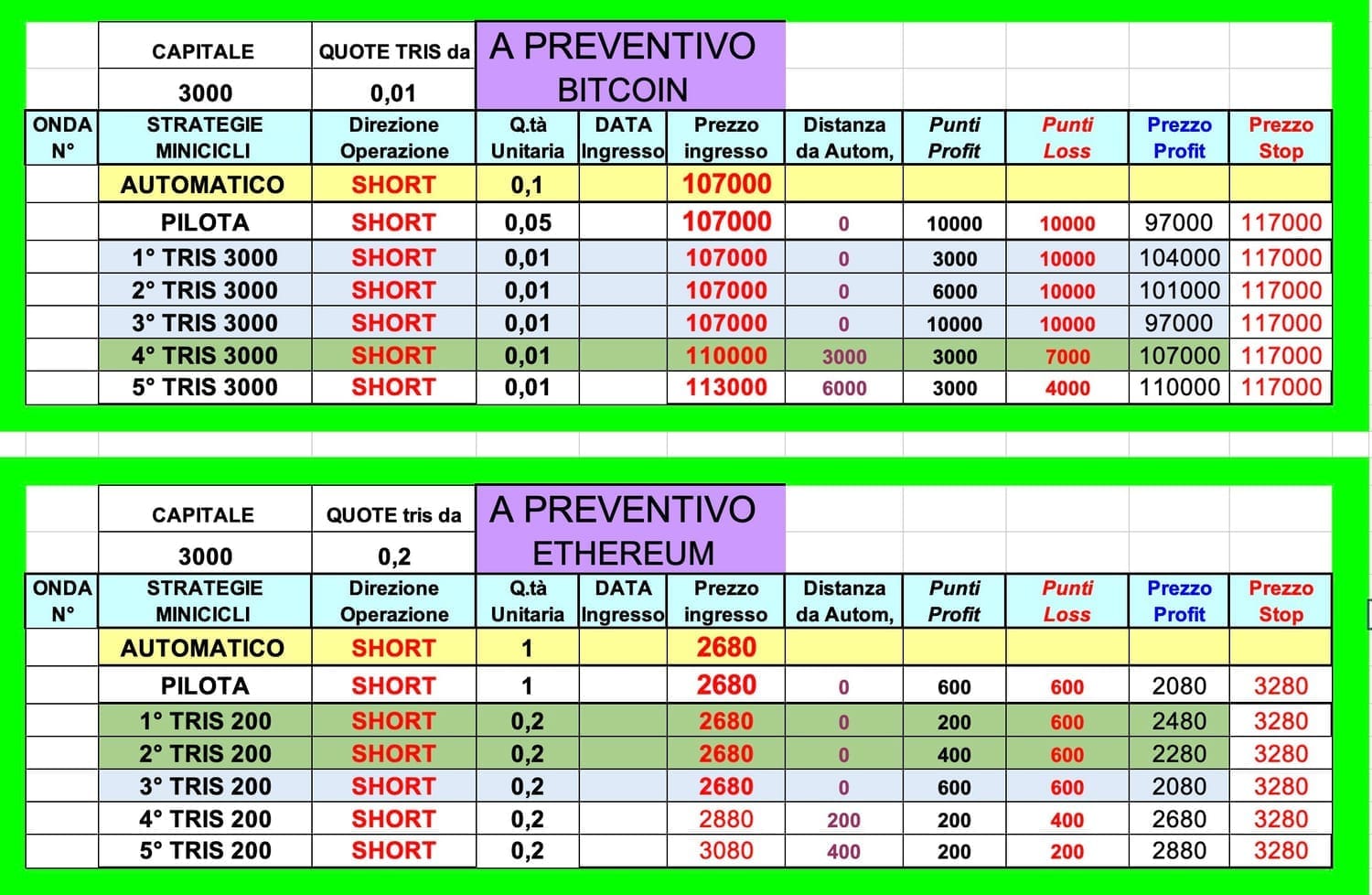 In pratica su ETHEREUM sarebbero già scattati i take profit di due quote su TRE mentre su BITCOIN è scattato il take profit della quarta quota da 110000 a 107000 dollari.