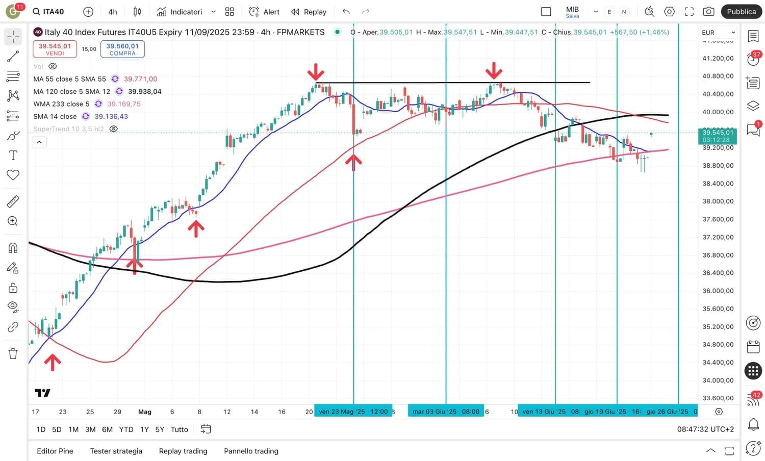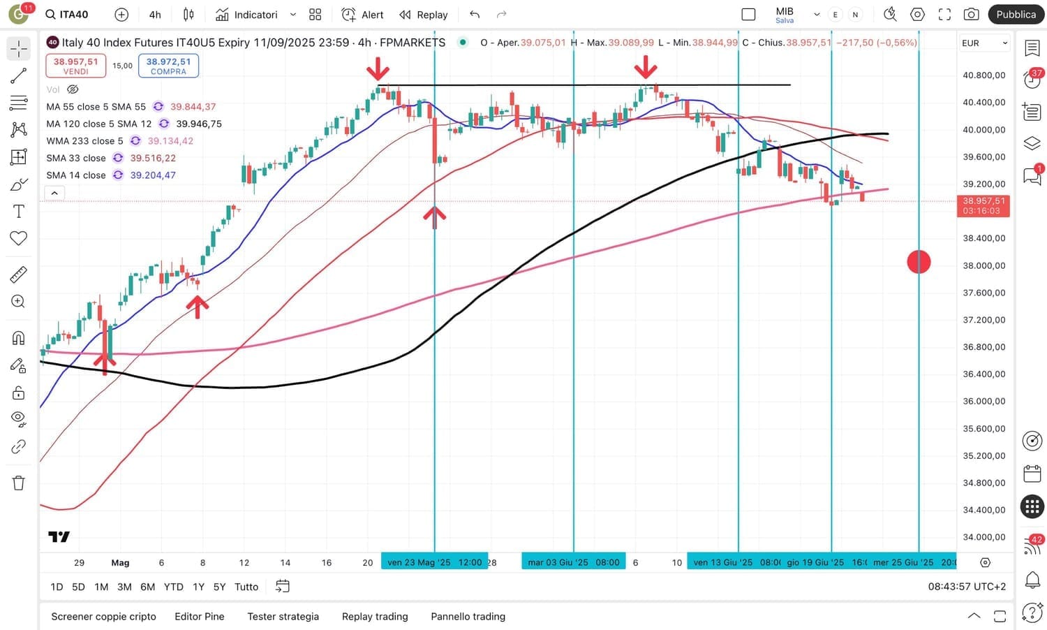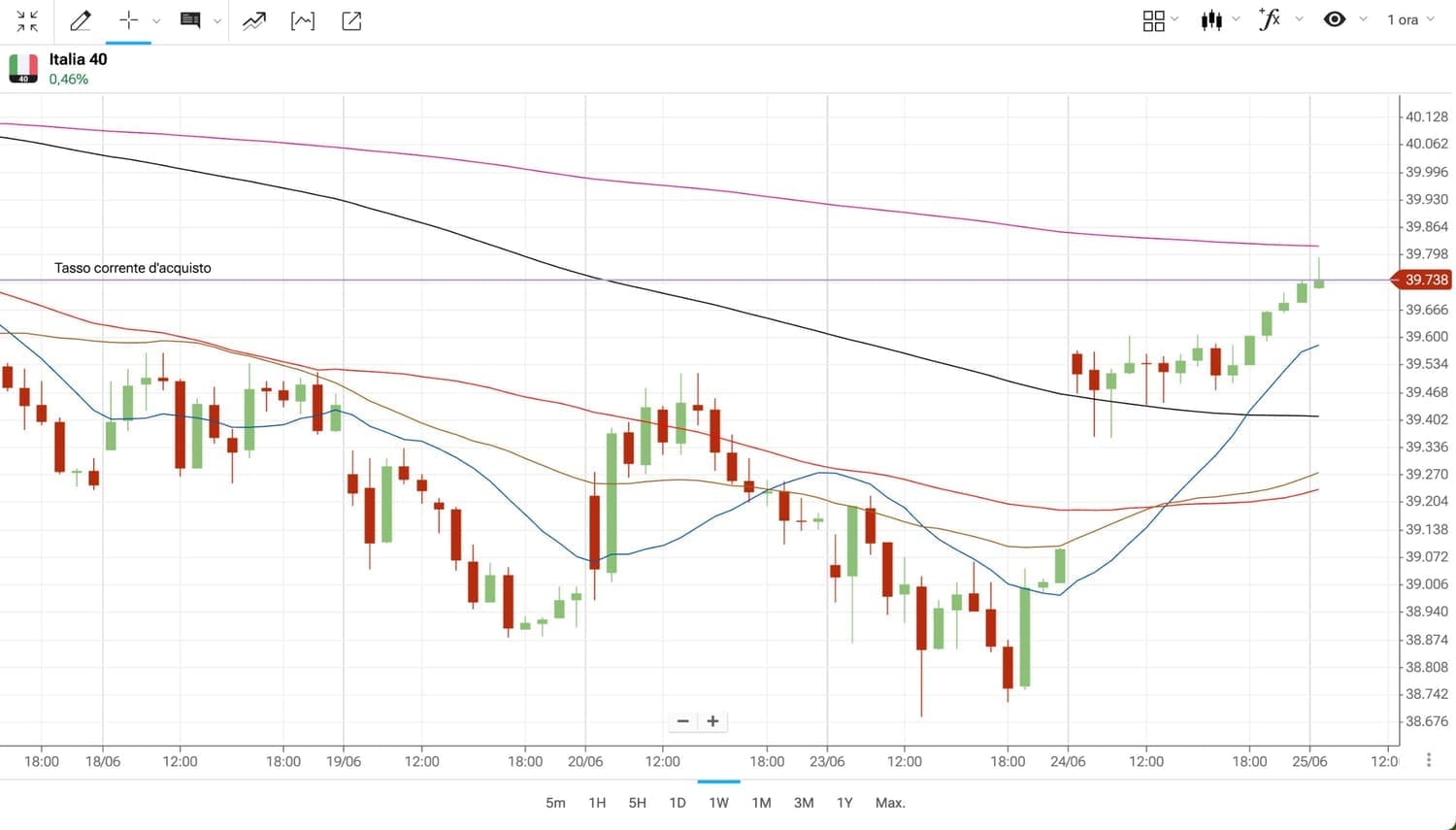 Il MIB future è tornato sopra i 39500 punti, rimbalzando dalla importante MEDIA MOBILE a 233 periodi sul grafico a 4 ore.