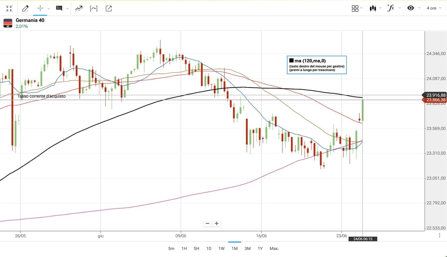 Il DAX è risalito sulla MEDIA MOBILE nera a 120 periodi (grafico a 4 ore) che dovrebbe fungere da RESISTENZA.